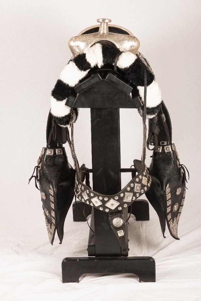 Sterling Silver Mounted Parade Saddle 15" seat. Sterling silver mounted, floral carved parade saddle made by the London Riding Shop in Pasadena. Solid silver horn and front with raised longhorns with red ruby eyes adorn the corner plates and long tapaderos. Fully trimmed in square silver conchos with raised domes. "AGH" engraved on cantle. Includes matching breast collar and headstall. $6,000-9,000