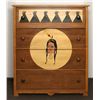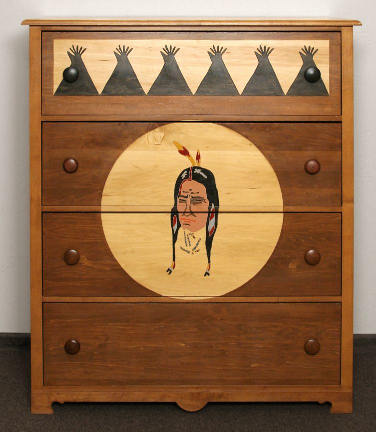 Sweet Water Ranch Chest Of Drawers. 51" x 43" x 23". Inlaid & painted wood Indian head design. In the tradition of Thomas Molesworth. Sweet Water Ranch stamped. Condition reports can be viewed at www.marchinmontana.com/docs/2013CR.pdf