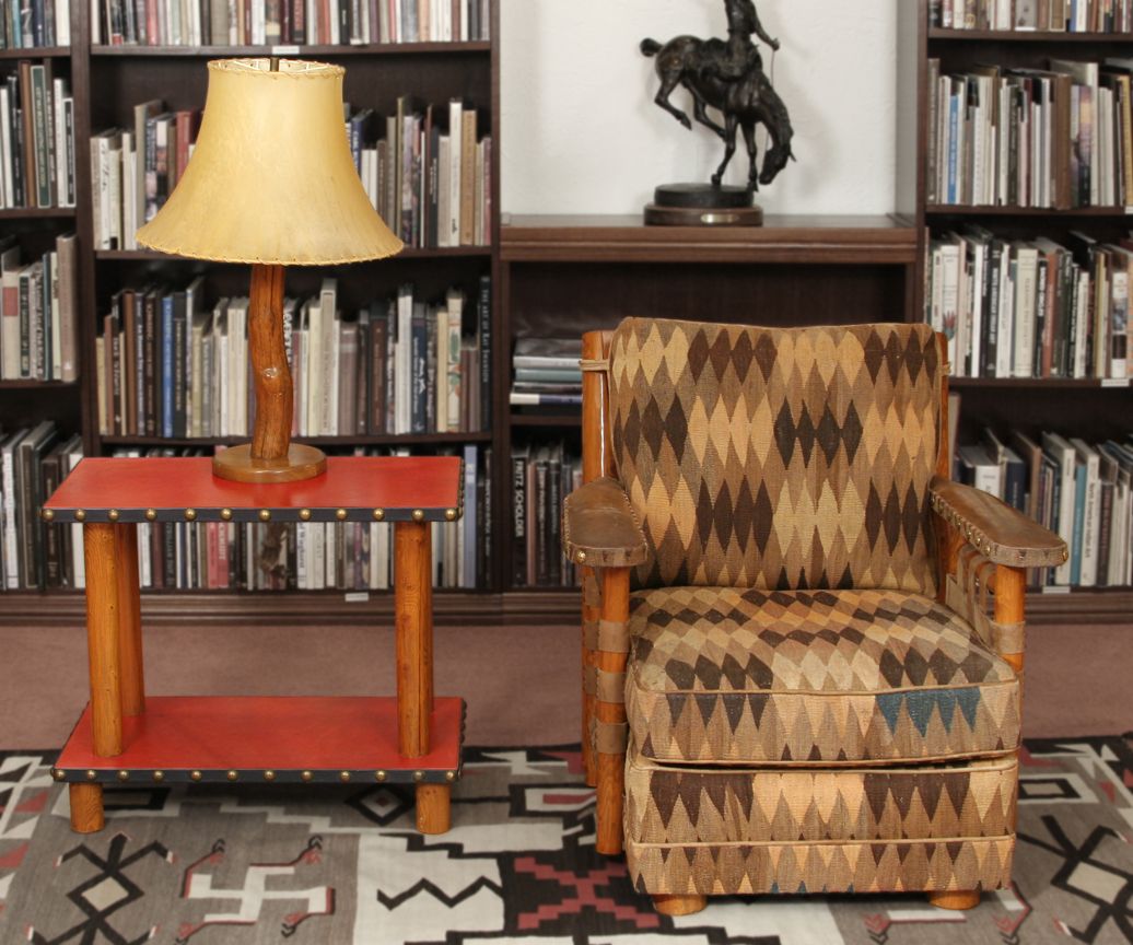 Sweet Water Ranch Club Chair. 32" x 31" x 32". Upholstered in Navajo weavings with a tacked leather trim. Sweet Water Ranch Side Table. 27" x 15" x 24". Red & black tacked leather. Sweet Water Ranch stamp along with craftsmen's names: Tim Lozier & Rick (Fly) Brod. Sweet Water Ranch Lamp. 28" tall table lamp with rawhide shade. Condition reports can be viewed at www.marchinmontana.com/docs/2013CR.pdf