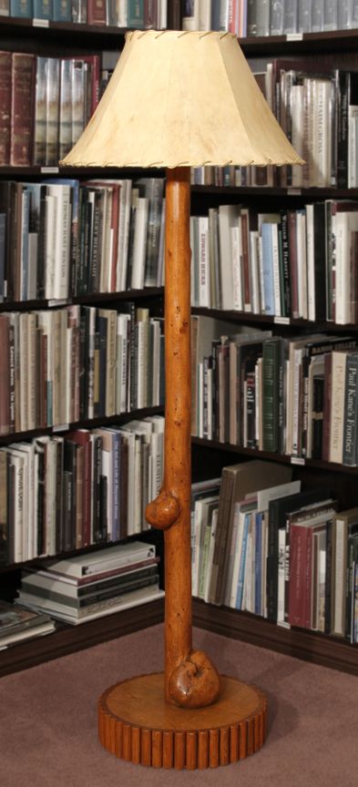 Sweet Water Ranch Lamp. 66" floor lamp with classic burlwood design & a rawhide shade. Sweet Water Ranch stamp along with craftsmen's names: Rick (Fly) Brod, Steve Cranford, Jolene Emmett & Tim Lozier. Condition reports can be viewed at www.marchinmontana.com/docs/2013CR.pdf