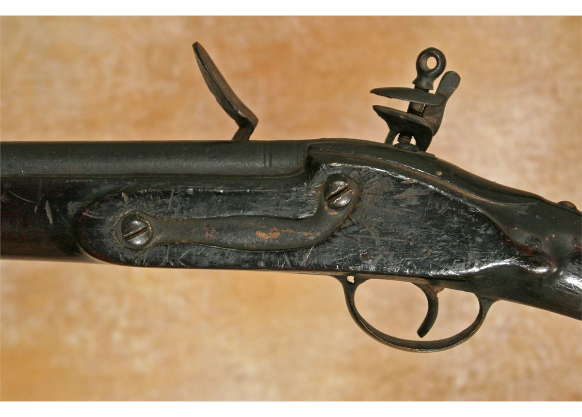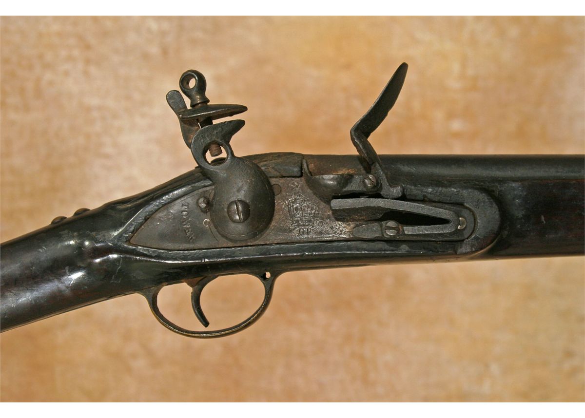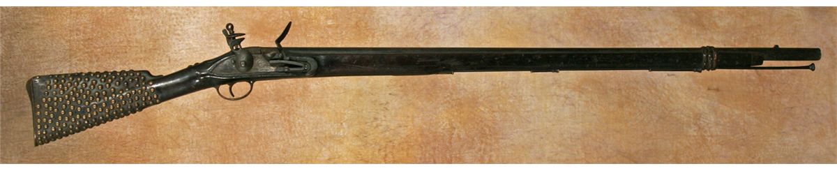 Tacked Tower Brown Bess Musket. .69 calibre, 40" barrel. Flintlock musket highly Indian decorated. Lock plate is marked TOWER with GR below a crown. Braided leather repair. Brass butt plate & trigger guard. Original ramrod. 18th century. Condition reports can be viewed at www.marchinmontana.com/docs/2013CR.pdf