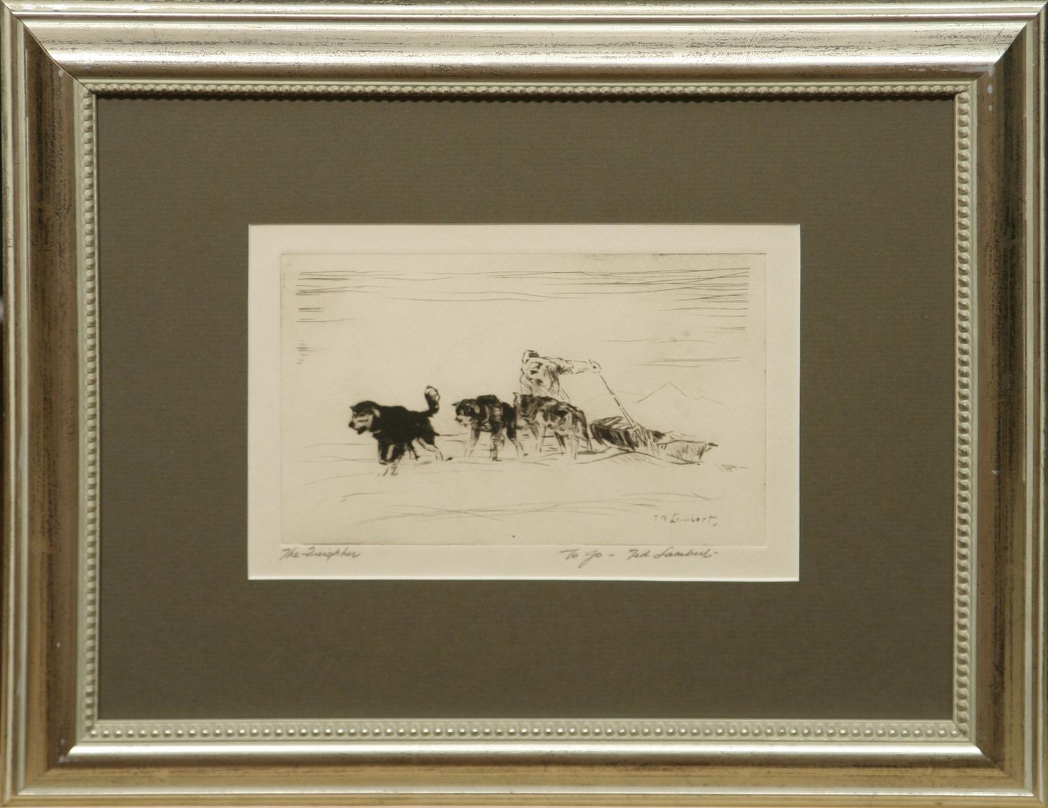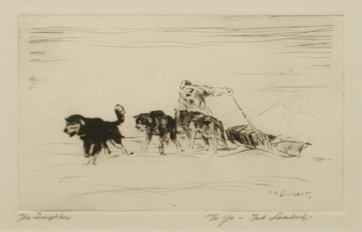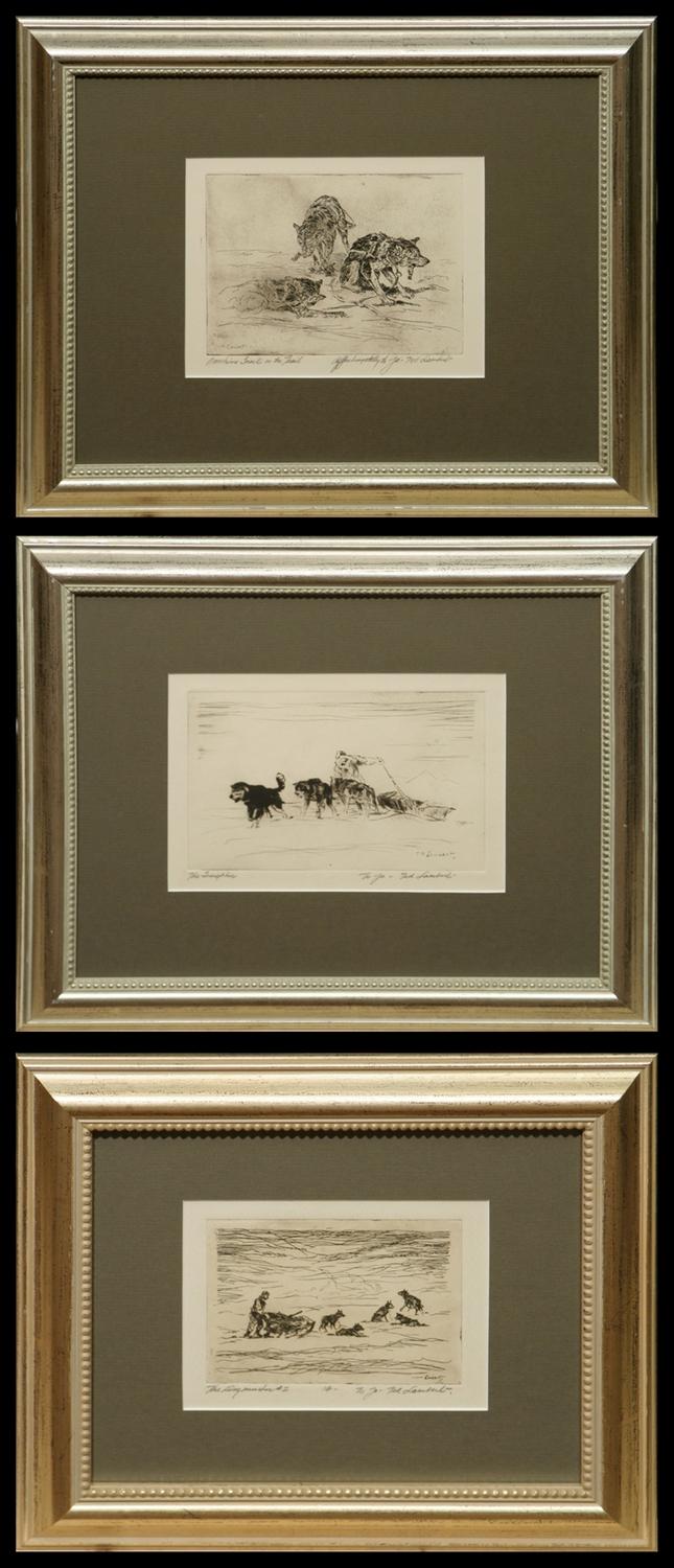 Ted Lambert (1905-1960). Three Etchings. (1) Noontime Snack On The Trail. 4 ¾" x 6 ¾". (2) The Freighter. 4 ¾" x 7 ¾". (3) The Dog Musher #2. 3 ½" x 5". Each pencil signed. (est $300-500) Condition Report: All crisp and clear. Nicely framed