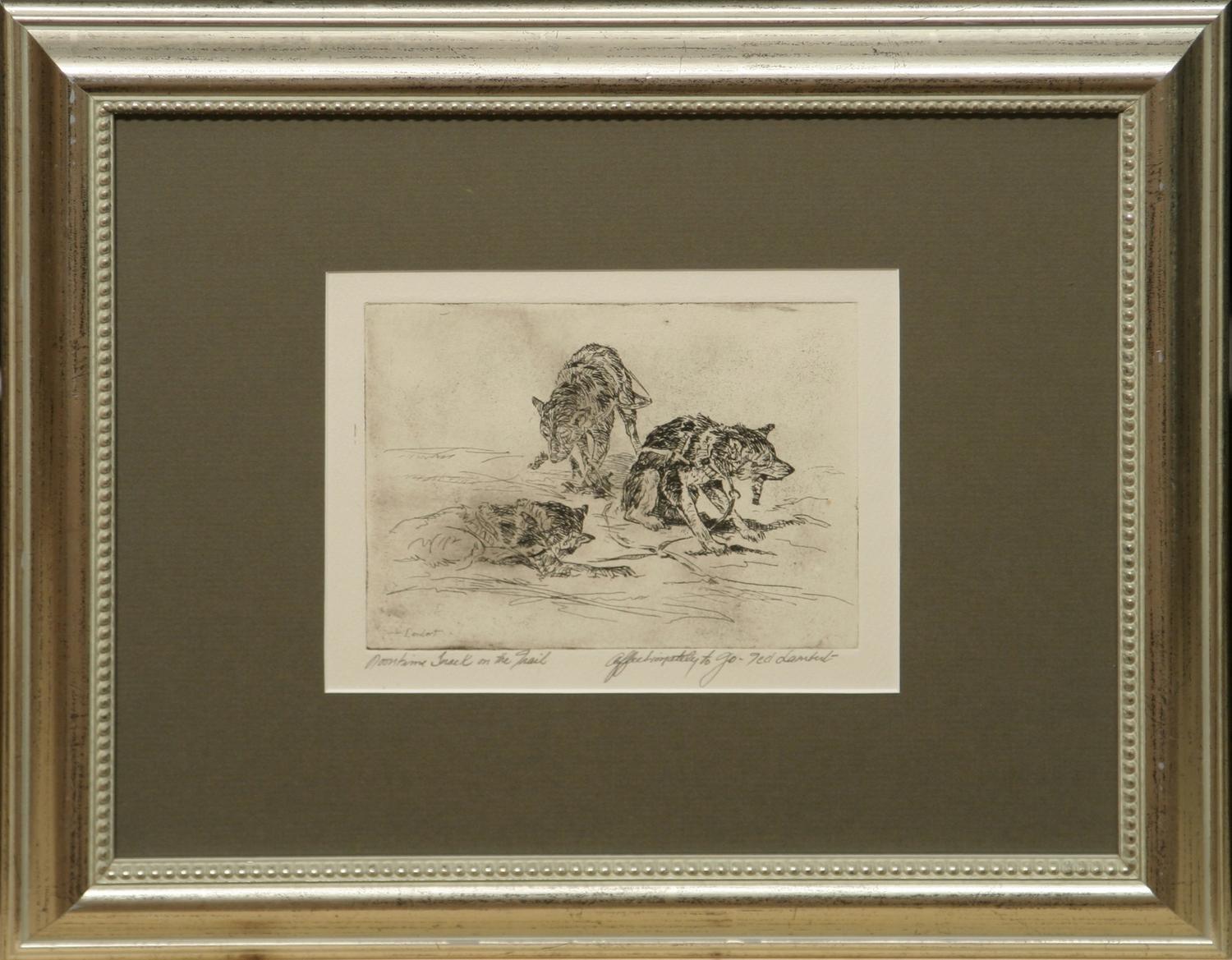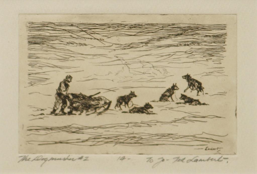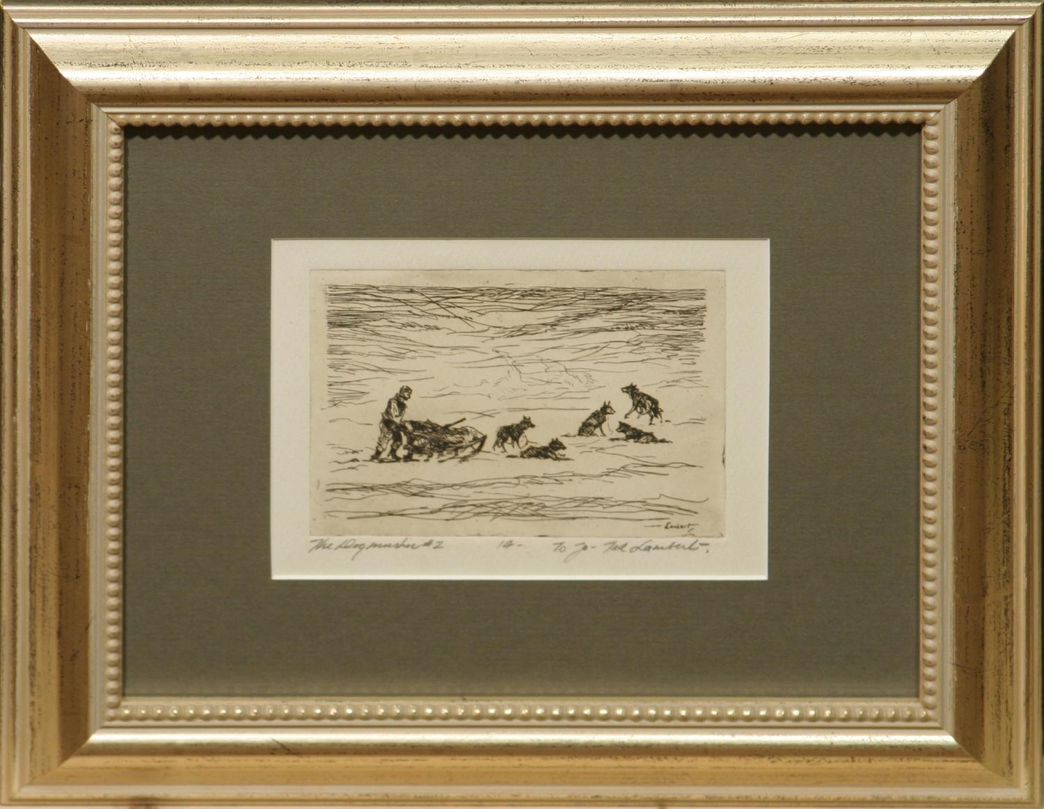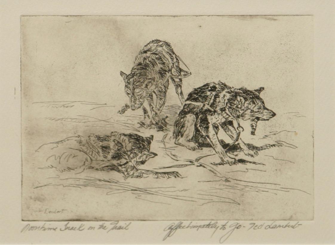 Ted Lambert (1905-1960). Three Etchings. (1) Noontime Snack On The Trail. 4 ¾" x 6 ¾". (2) The Freighter. 4 ¾" x 7 ¾". (3) The Dog Musher #2. 3 ½" x 5". Each pencil signed. (est $300-500) Condition Report: All crisp and clear. Nicely framed
