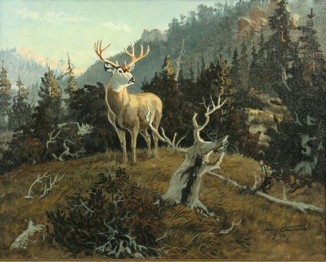 Terry Bateman (1942 - ). Deer In The High Country. 16" x 20" oil on canvas. Signed lower right: Terry Bateman '73. Condition reports can be viewed at www.marchinmontana.com/docs/2013CR.pdf