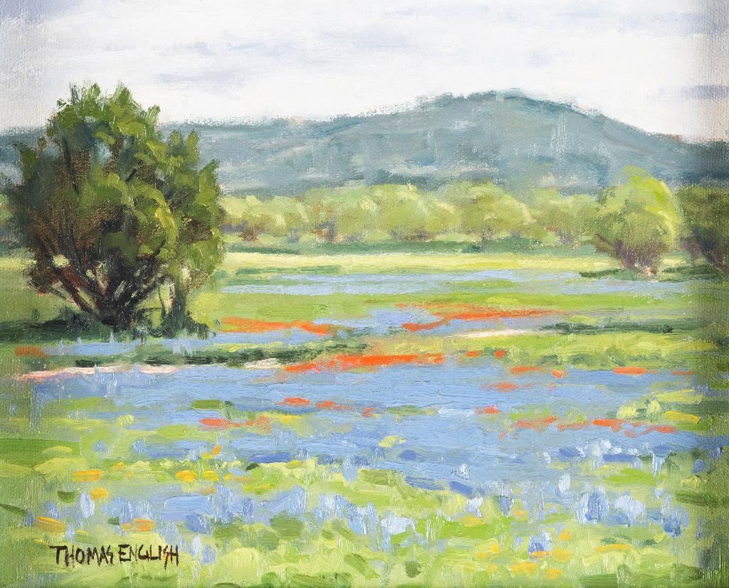 Thomas English (1949 - ) Five works: 1) Summer Aspens 10" x 12" oil on canvasboard Signed lower left 2) Gallatin River 10" x 12" oil on canvas Signed lower left 3) Hell Gate Valley, Missoula, Mont. 10" x 12" oil on canvasboard Signed lower right 4) Blue Bonnets and Paint Brush 8" x 10" oil on board Signed lower left 5) Above Swift Current 8" x 10" oil on canvasboard Signed lower left $1,000-1,500