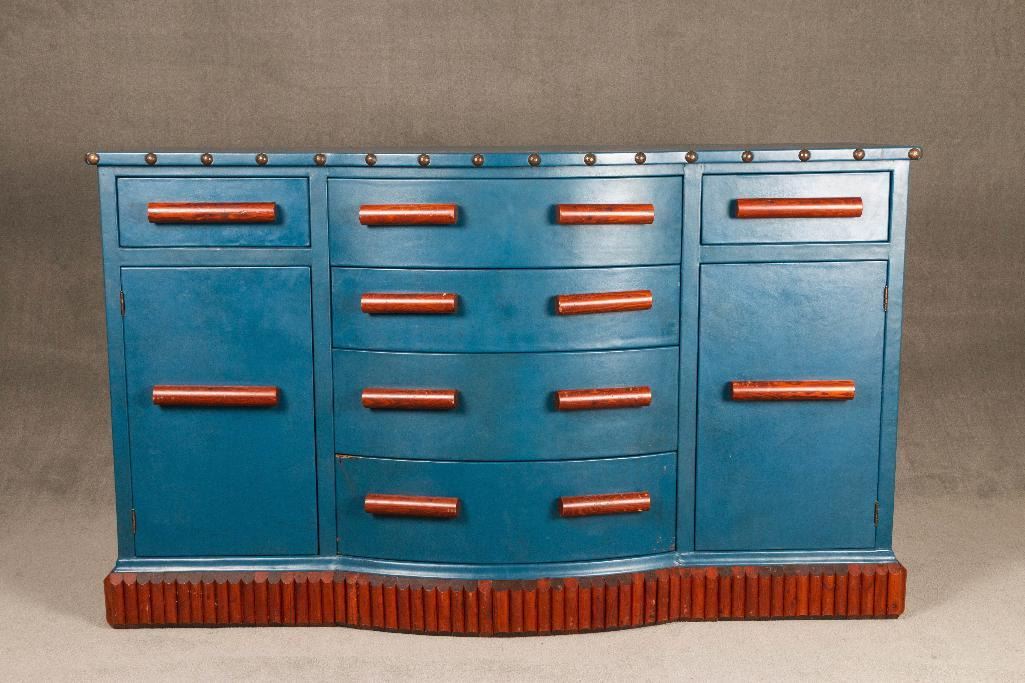 Thomas Molesworth (1890-1977) 36" x 59" x 21". Fir and blue leather sideboard with six drawers and two cabinets. Circa 1945. $4,000-6,000 Provenance: Lanaux Collection, New Orleans, LA.