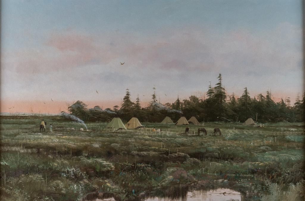 Thomas de Decker (1951 - ) Camp at Sunrise 24" x 36" oil on board Signed lower right $2,000-3,000 Provenance: Private Collection, Washington State.