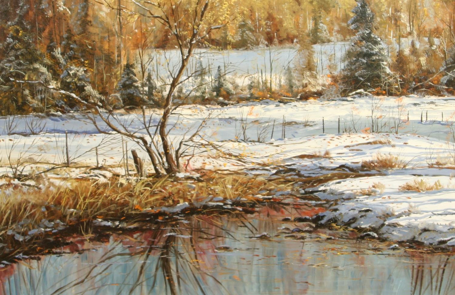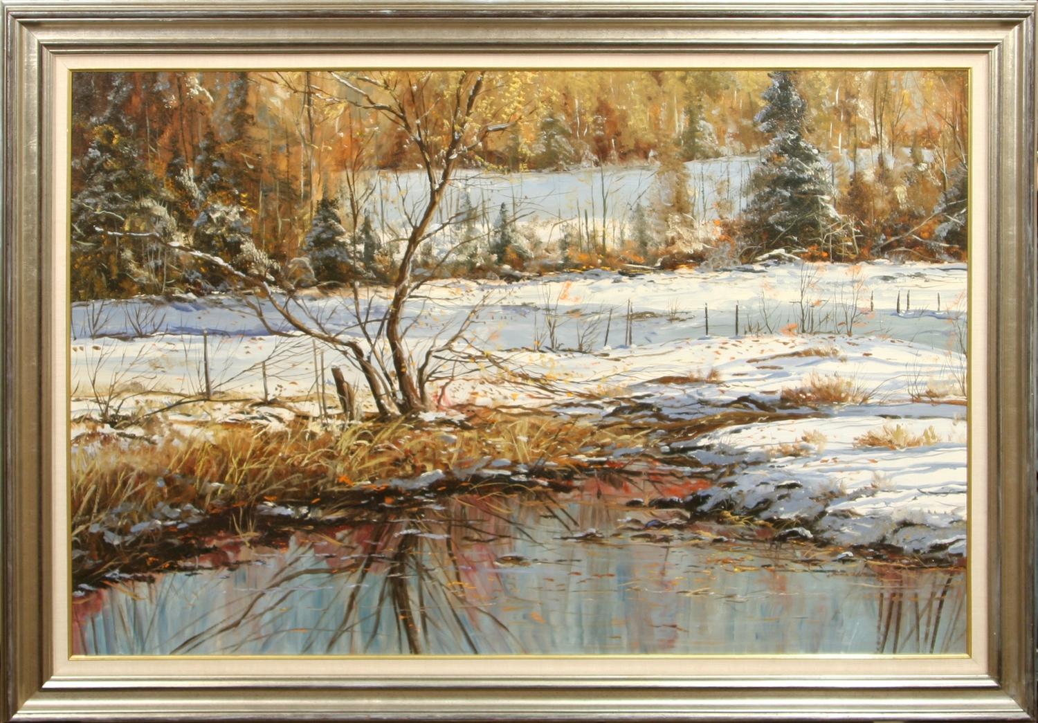 Thomas deDecker (b. 1951). Landscape. 40" x 60" oil on board. signed lower right. (est $2,000-3,000) Condition Report: Black lights clean. Frame shows minor scratches