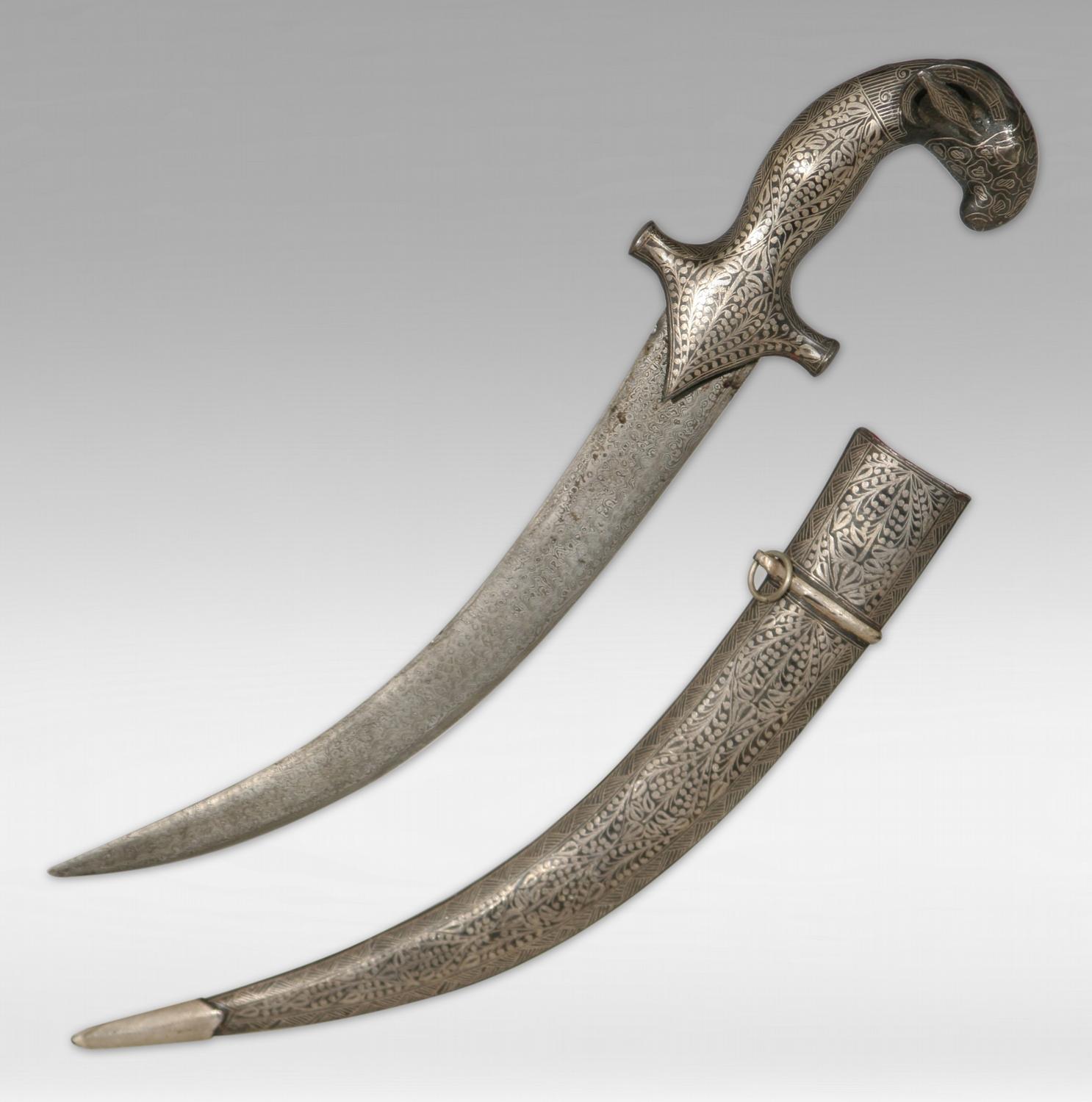 Three Persian Silver Inlaid Daggers. Fabulous silver inlay, fine condition. Rooster 18", Ram 19" & Jaguar 12". (est $1,500-2,000) Condition Report: All fine and showing beautiful patina