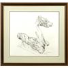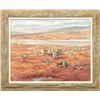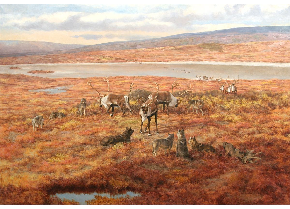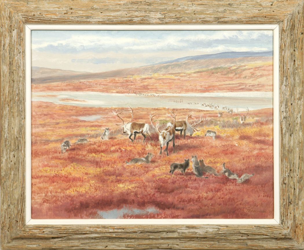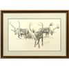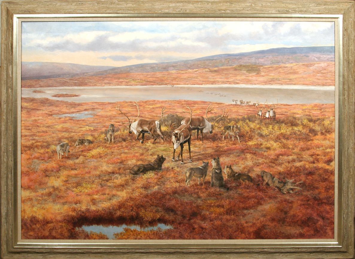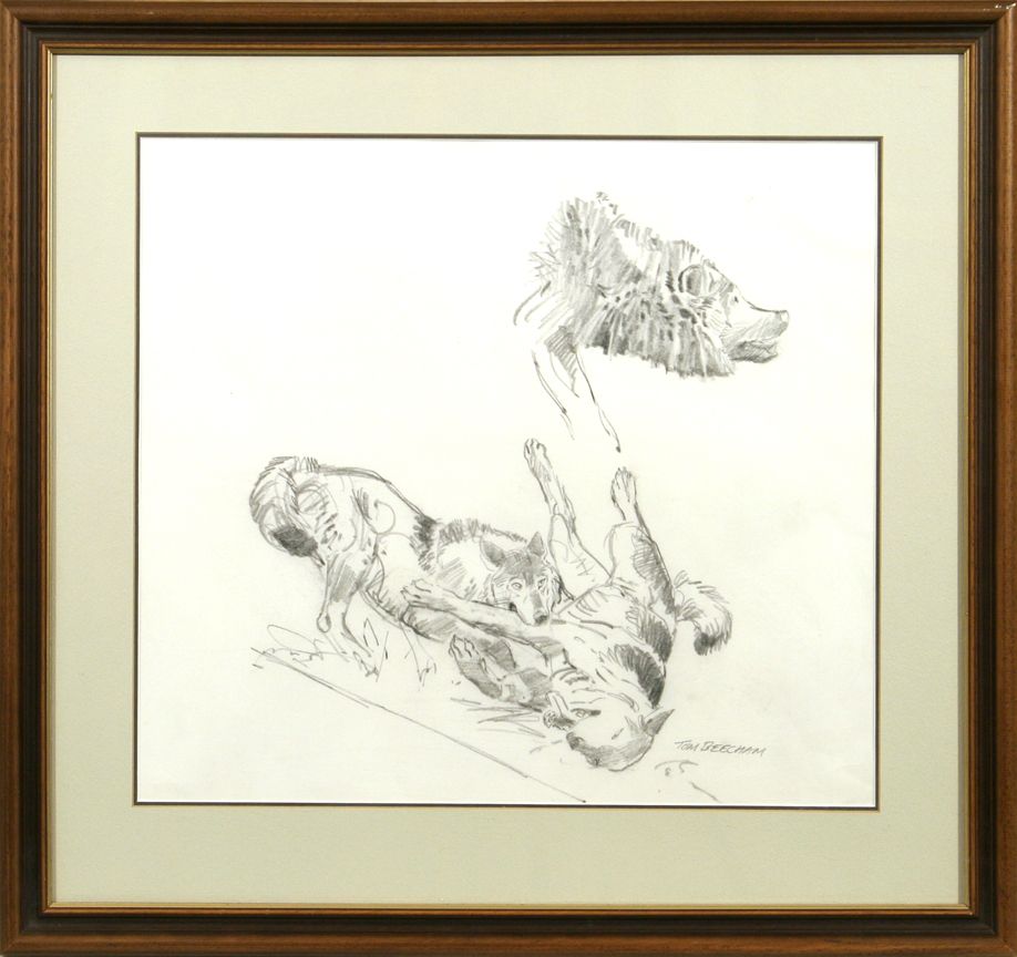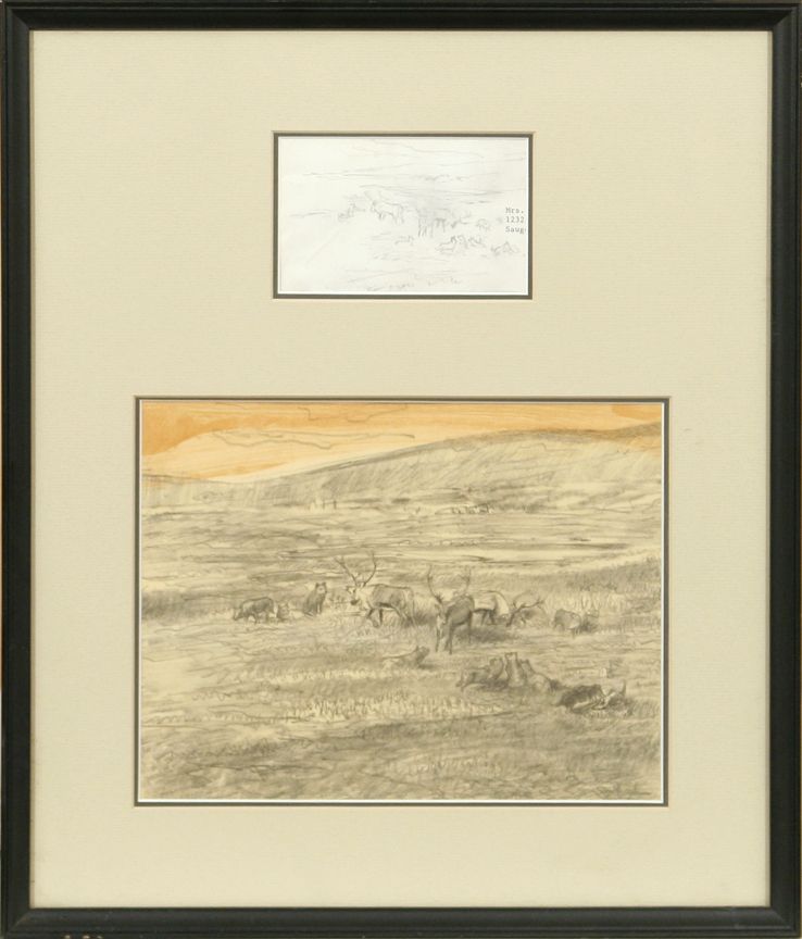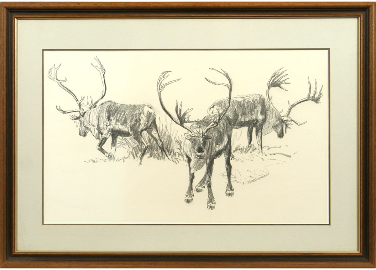 Tom Beecham (1926 - 2000). Caribou With Wolves. 50" x 72" oil on canvas. Signed lower right: T BEECHAM '84. The largest Beecham to ever come up for auction. Included with this lot are four studies for this commission: 2.75" x 4.5" pencil sketch on an envelope & 7" x 9" pencil on paper study (framed together). 13" x 17" oil sketch on board. Signed lower right; T BEECHAM '84. 16" x 18" pencil on paper, Study of Wolves. Signed lower right: TOM BEECHAM. 17" x 21" pencil on paper, Caribou Study. Signed lower right: TOM BEECHAM. Condition reports can be viewed at www.marchinmontana.com/docs/2013CR.pdf