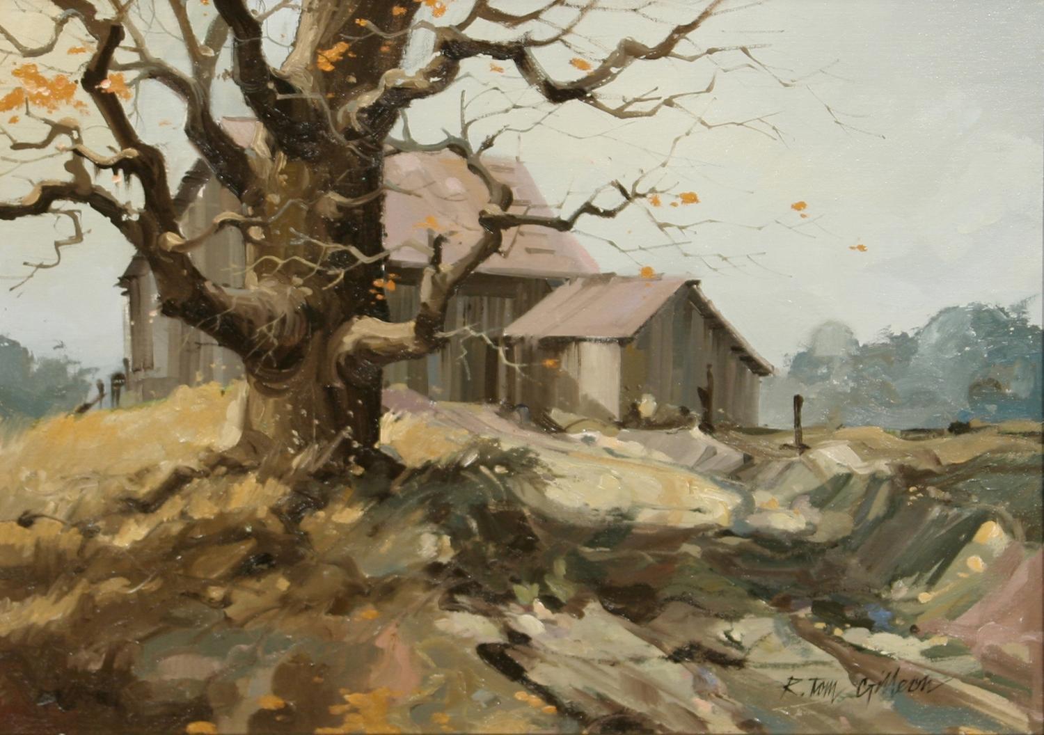 Tom Gilleon (b. 1942). The Last Leaves. 22" x 32" oil on board. signed lower right. (est $3,000-4,000) Condition Report: Black lights clean. Newly and nicely framed
