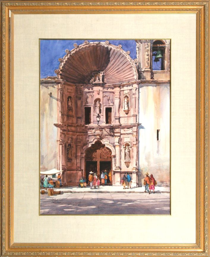 Tom Hill (1925 - ). La Iglesia De la Salud, San Miguel, Mexico. 29" x 22" watercolor. Signed lower left: TOM HILL, MEXICO. Condition reports can be viewed at www.marchinmontana.com/docs/2013CR.pdf