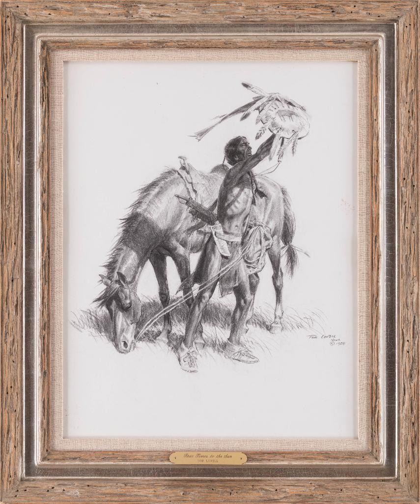 Tom Lovell (1909-1997)(NAWA)(CA) Four Times to the Sun 22.5" x 17.5" charcoal Signed and dated 1988 lower right, NAWA Verso: "A Cheyenne's shield offered spiritual as well as physical protection and every man had to go thru a certain ceremony. His shield was taken from its case, held up in his right hand, shaken four times, held up to the sun four times, then placed on his left arm, where it was carried in battle. -Tom Lovell." $4,000-6,000