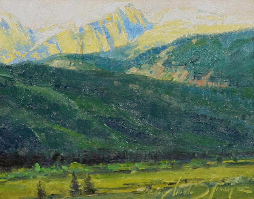 Trey Finney (b. 1963). Moraine Park - Illuminated. 8" x 10" oil on board. signed lower right. (est $1,000-1,500) Condition Report: Black lights clean. Fine gold frame.