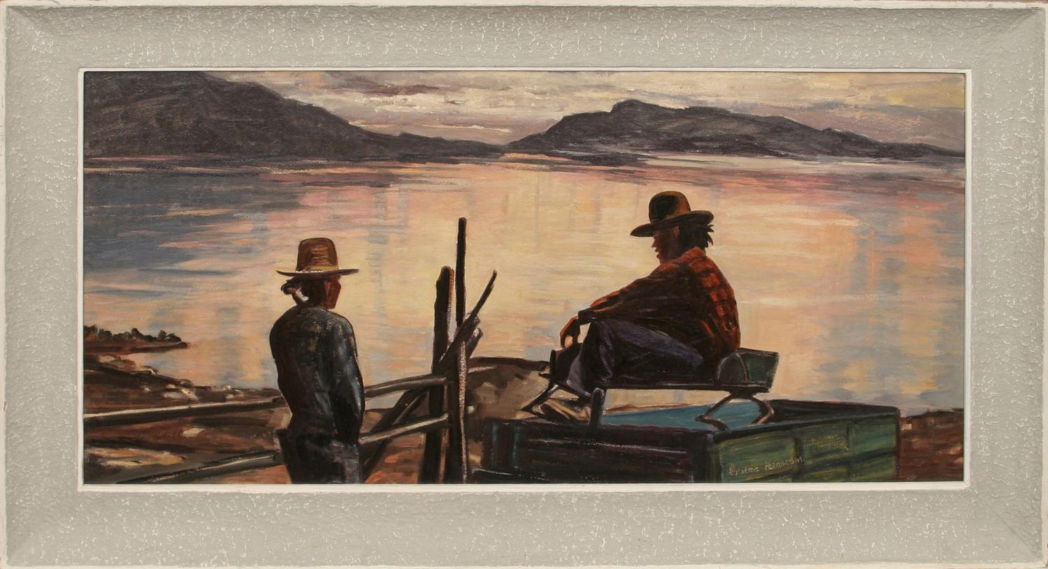 Trude Hanscom (1890-1975). Navajo Land. 19" x 38" oil on board. signed lower right. (est $500-800) Condition Report: Black lights clean