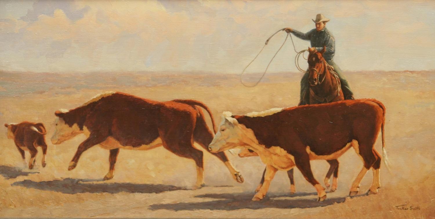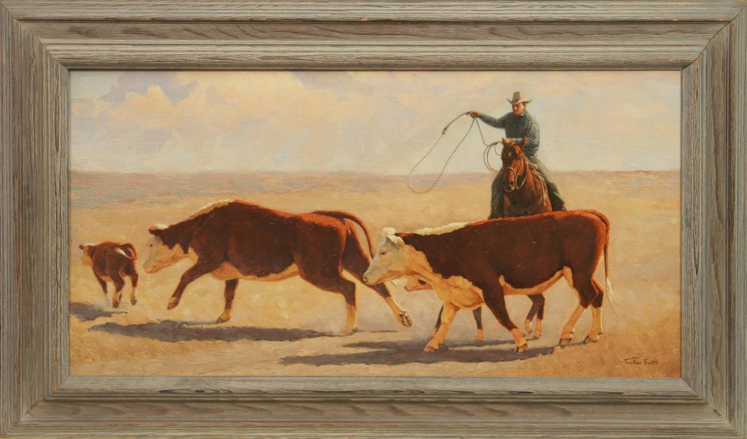 Tucker Smith (b. 1940). Cowboy Herding Cattle. 16" x 30" oil on canvas. signed lower right, dated on back '73. (est $5,000-10,000) Condition Report: Black lights clean