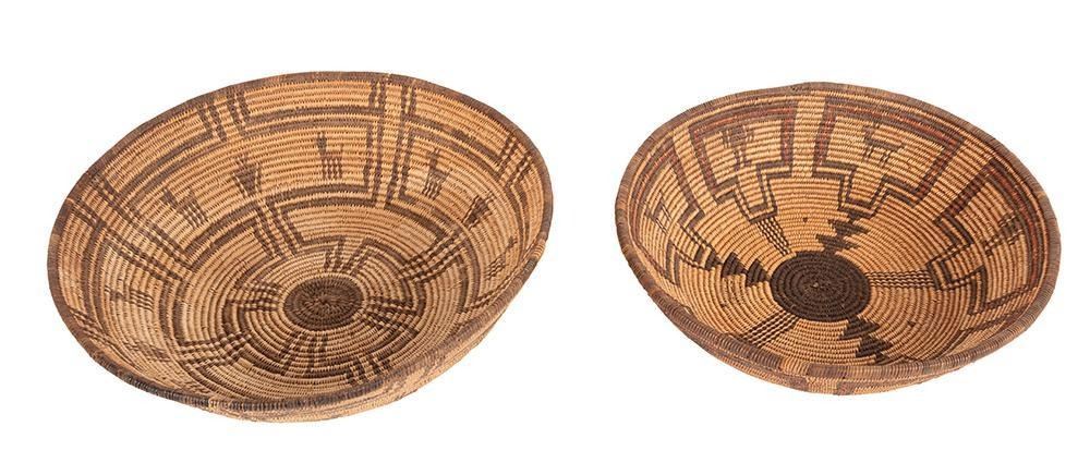 Largest is 11.75" diameter x 3.5", smaller is 10.25" diameter x 3". Woven with dog and half human figures. Larger basket features the top of a human, smaller depicts the bottom half.