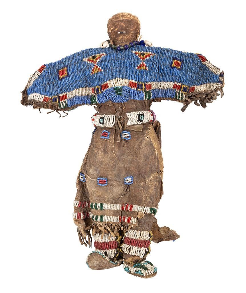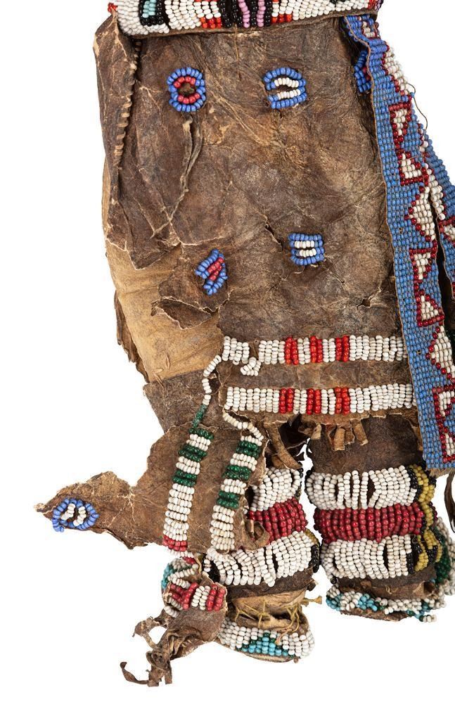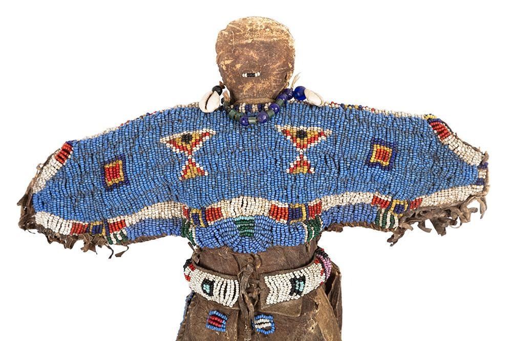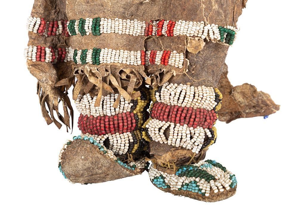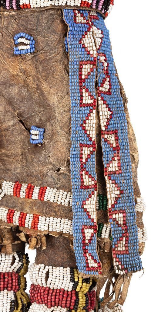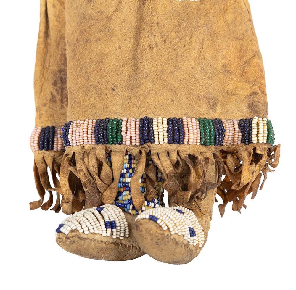Larger is 14" x 11" with a fully beaded yoke, large trade bead necklace with a cowry shell accent, fully beaded moccasins and a loom beaded belt.