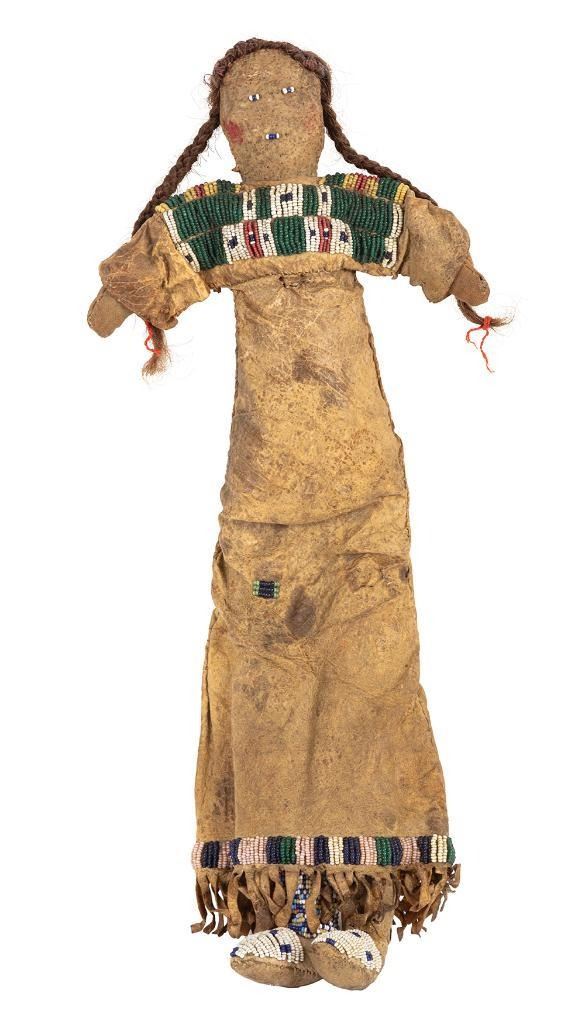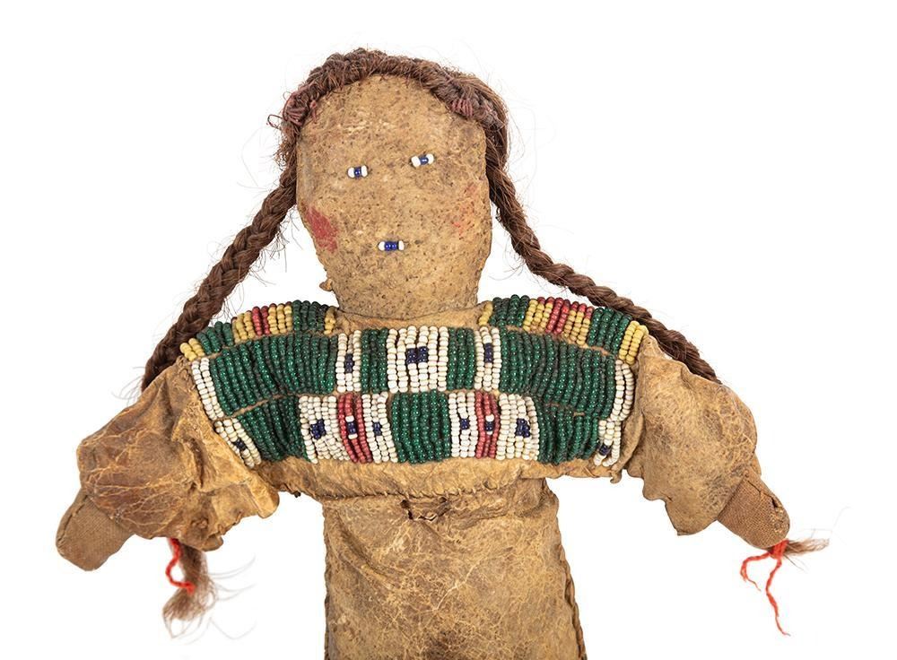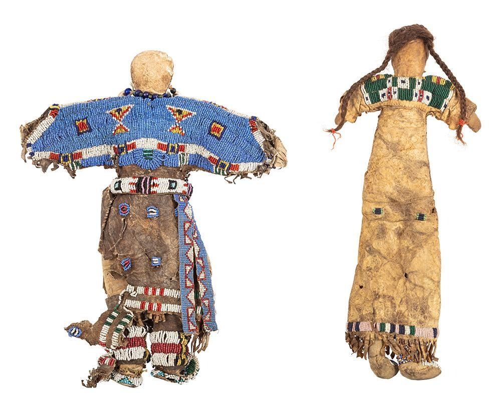 Smaller is 15" x 6" with a beaded yoke, red ochre accents on doll's cheeks, human hair braids and beaded moccasins.
