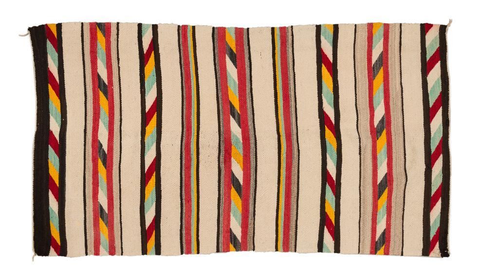 Two Navajo Saddle Blankets 1) Navajo Saddle Blanket 3'4" x 2'8". Single saddle blanket. Circa 1940. 2) Navajo Saddle Blanket 5' x 2'9". Double sided saddle blanket with banded designs. Circa 1945. $800-1,200