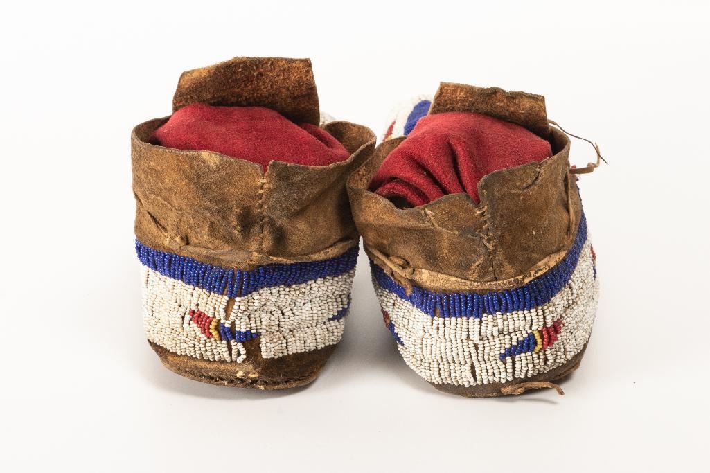 Two Pair of Cheyenne Moccasins 1) Beaded Man's Moccasins 11" long with geometric designs fully beaded tongues. Initials "JR" beaded on cuff. Early 20th century. 2) Beaded Man's Moccasins 10.25" long with buffalo track beaded designs. Early 20th century. together with: 3) Crow Beaded Cuffs 8.25" long x 6.5" at widest point, accented with 5" fringe. Beaded in floral designs, lined with trade cloth. Early 20th century. $800-1,200