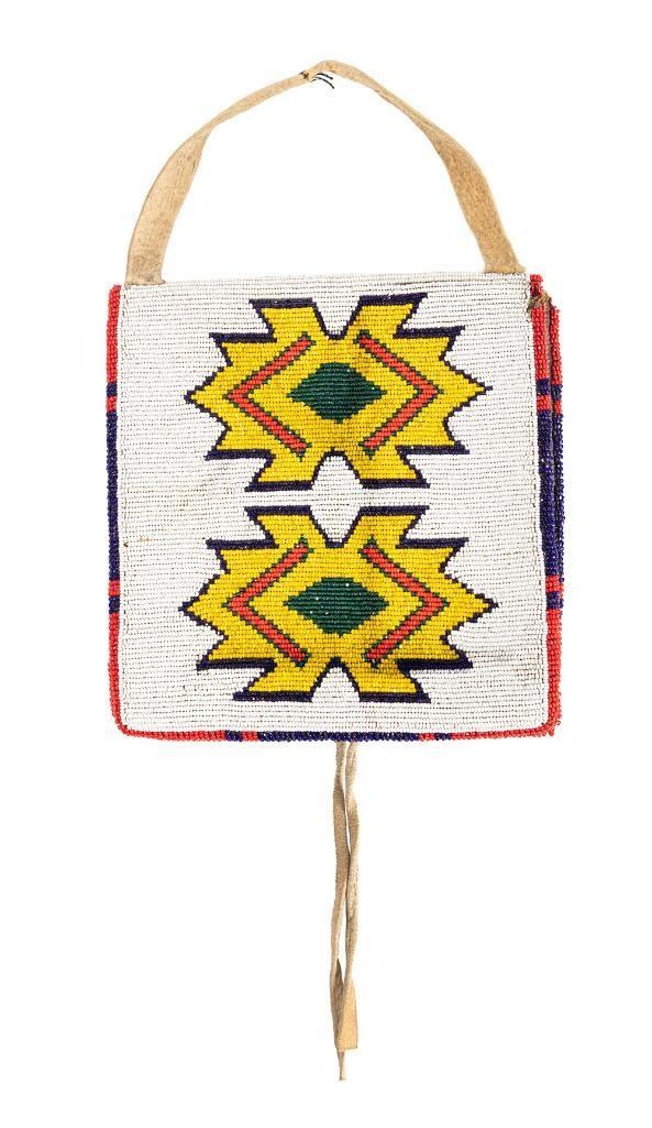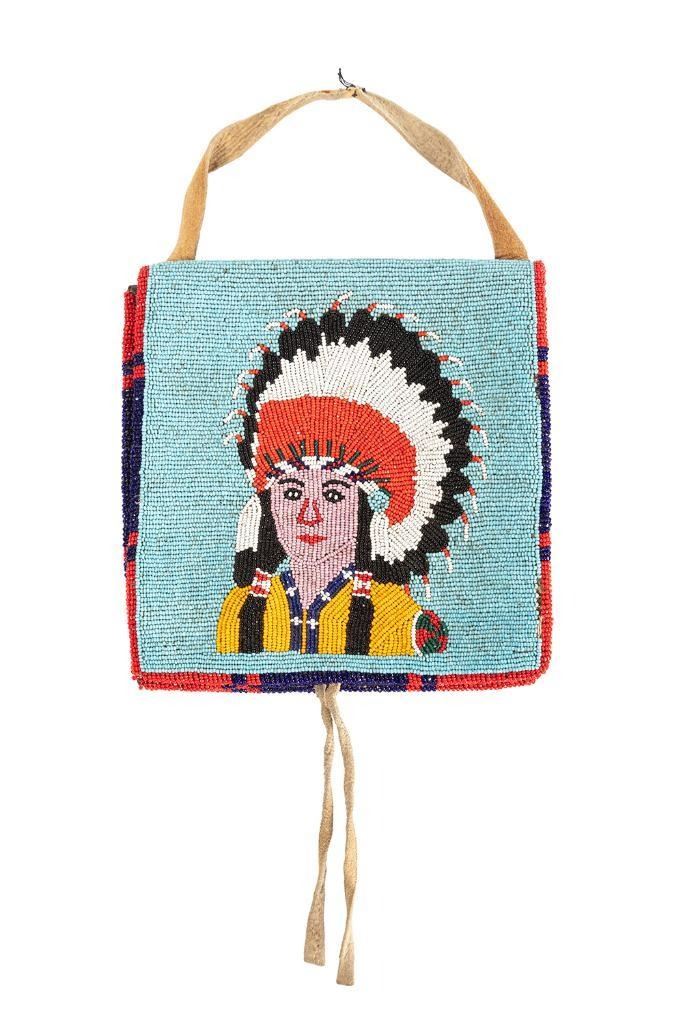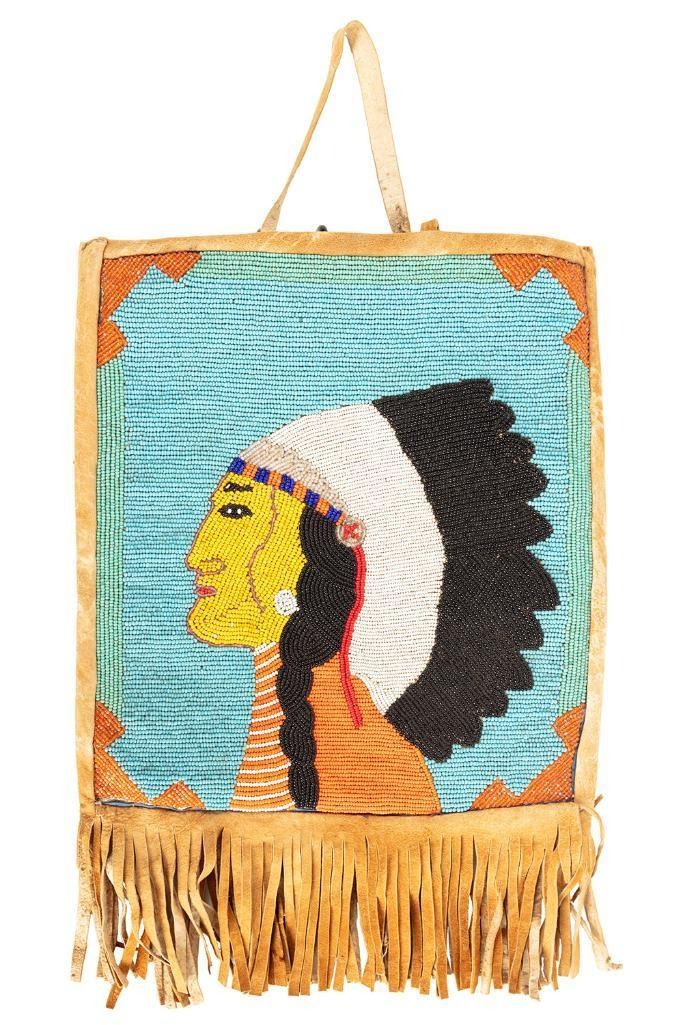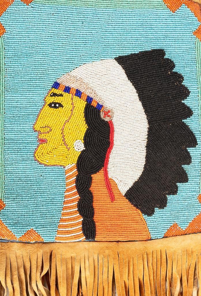 2) 7" x 6.5" overall. Pictorial beadwork depicting Native Chief on one side and geometric pattern on the other side. Both mid 20th century.