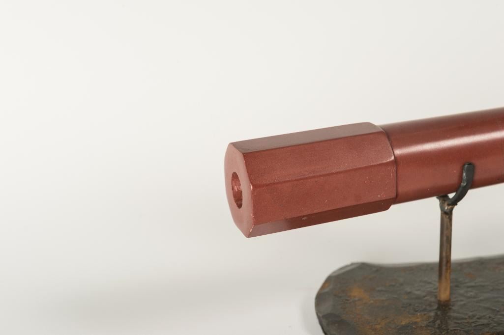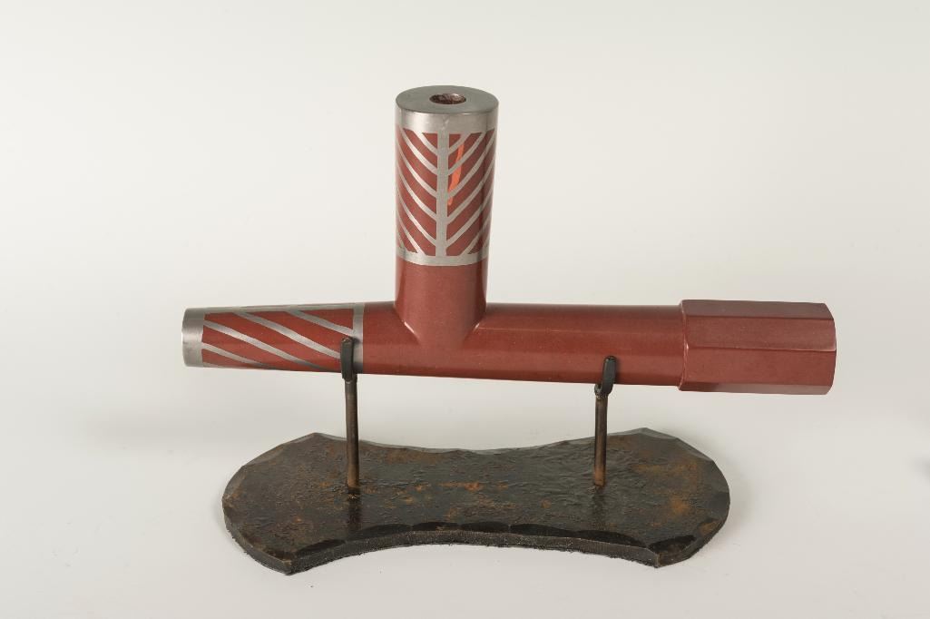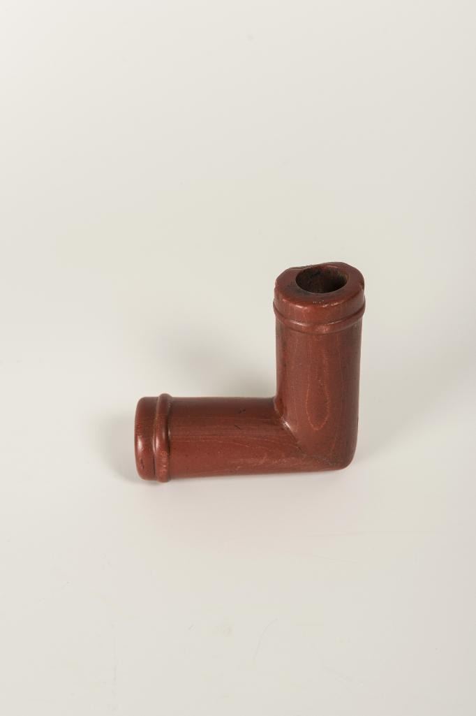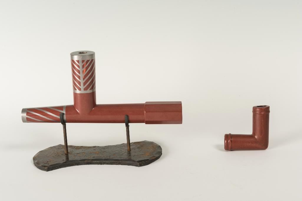Two Sioux Catlinite Pipebowls 1) 9.75" x 4.25". Large pipe with lead inlay. Beautiful craftsmanship by a contemporary maker. Includes custom stand. 2) 2.5" x 2.5" small pipe carved with initials HT. 19th century. $800-1,200