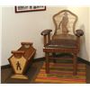 Sweet Water Ranch Keyhole Chair & Magazine Rack. 39" x 27" x 22" chair with cowgirl cutout designs. Brindle cowhide upholstery with tacked leather & rope trim. 18" x 21" x 15" magazine rack with cutout cowboy design. Sweet Water Ranch stamp along with craftsmen's names: Rick (Fly) Brod & Tim Lozier. Condition reports can be viewed at www.marchinmontana.com/docs/2013CR.pdf
