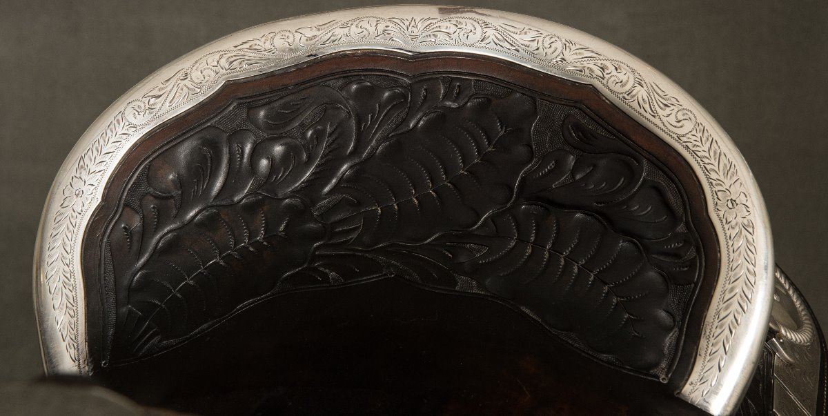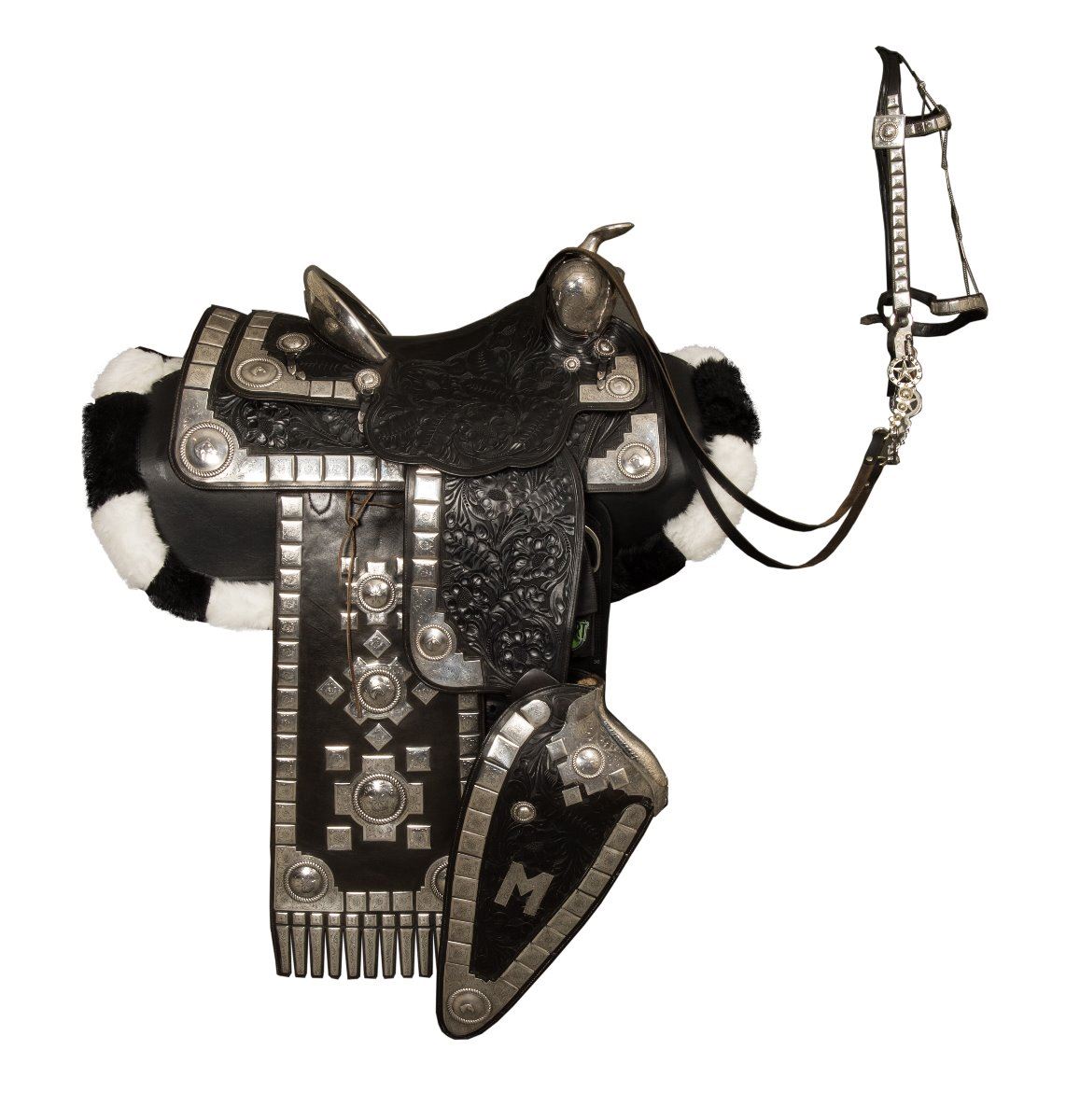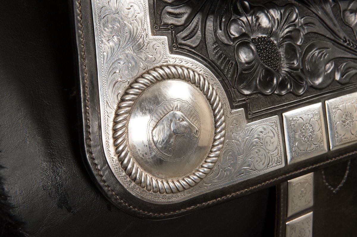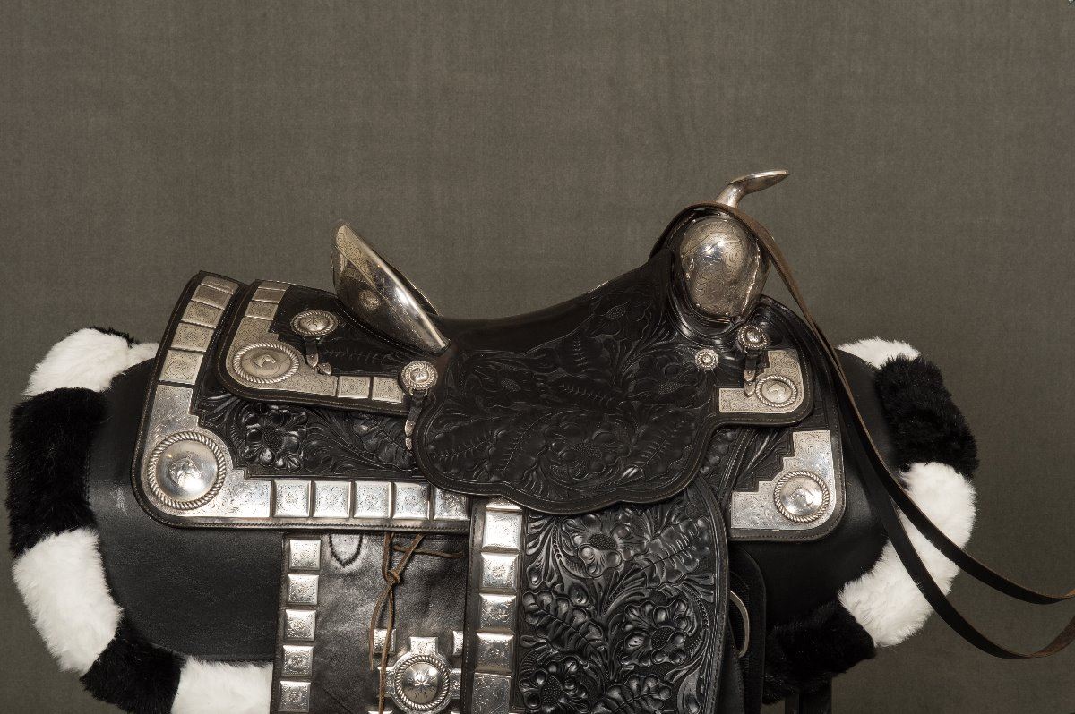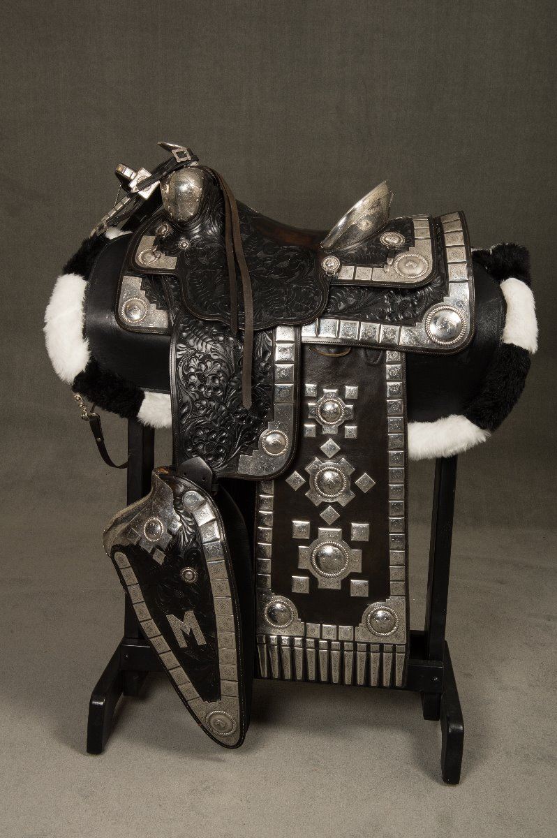Unmarked, Fully Tooled Saddle . Silver plate has been rubbed down, but is probably Keyston Brothers Silver Saddle. 14 ½" seat. Decorated with horse heads, tapaderos, serape and matching bridle. Modern corona and silver mounted bit. Circa 1940s.
