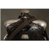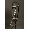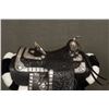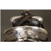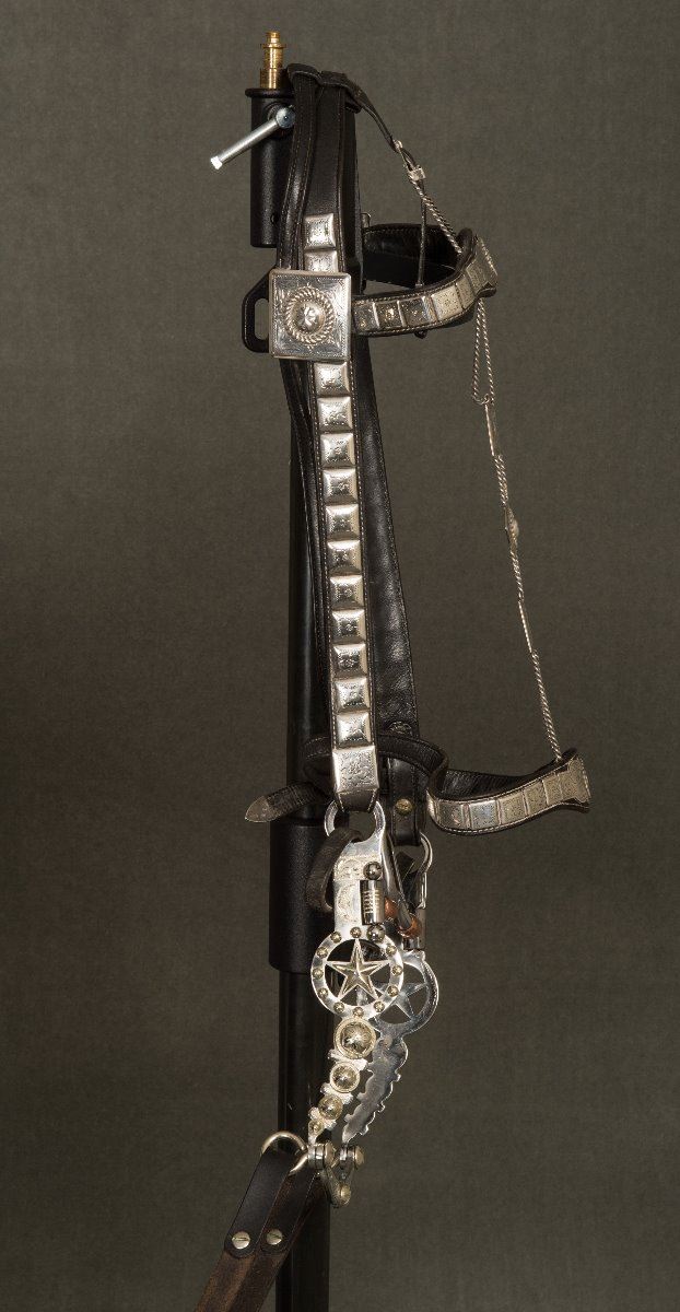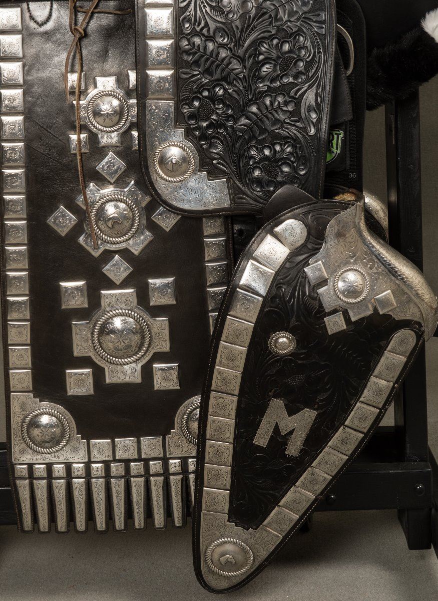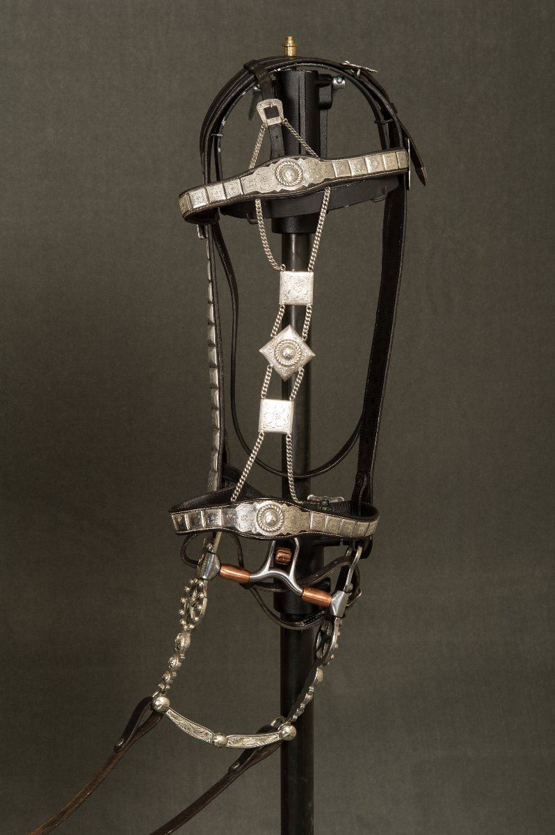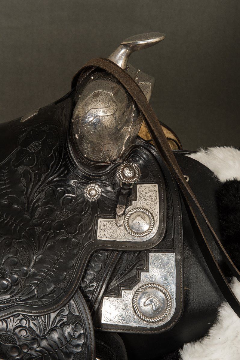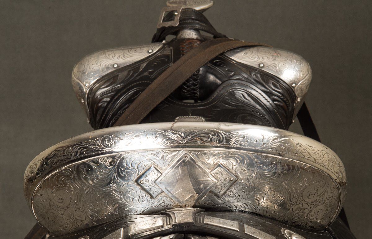 Unmarked, Fully Tooled Saddle . Silver plate has been rubbed down, but is probably Keyston Brothers Silver Saddle. 14 ½" seat. Decorated with horse heads, tapaderos, serape and matching bridle. Modern corona and silver mounted bit. Circa 1940s.