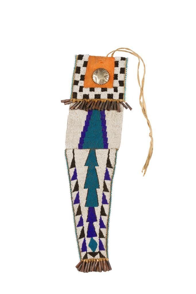 16.5" overall. Accented with tin cones and an intricately beaded border along with star concho on tab. Circa 1880.