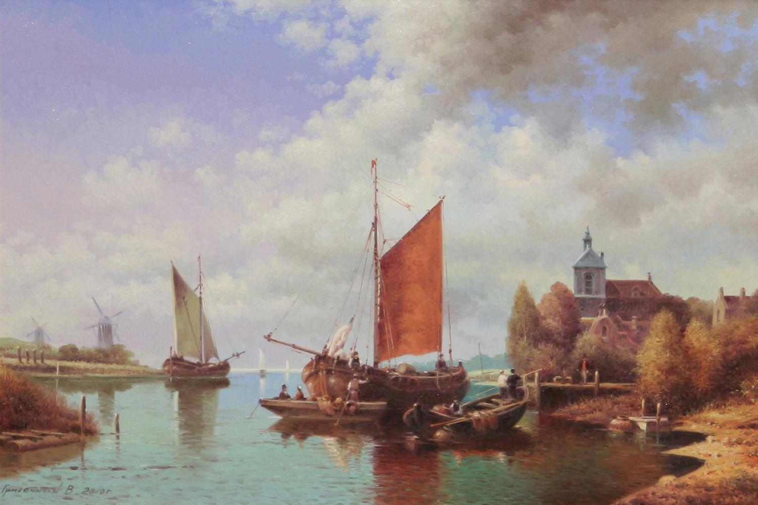 Vasiliy Nicholayevich Gribennikov (b. 1951). View With The Ship. 14" x 20" oil on canvas. signed lower left. (est $1,500-$2,500) Condition Report: Black lights clean