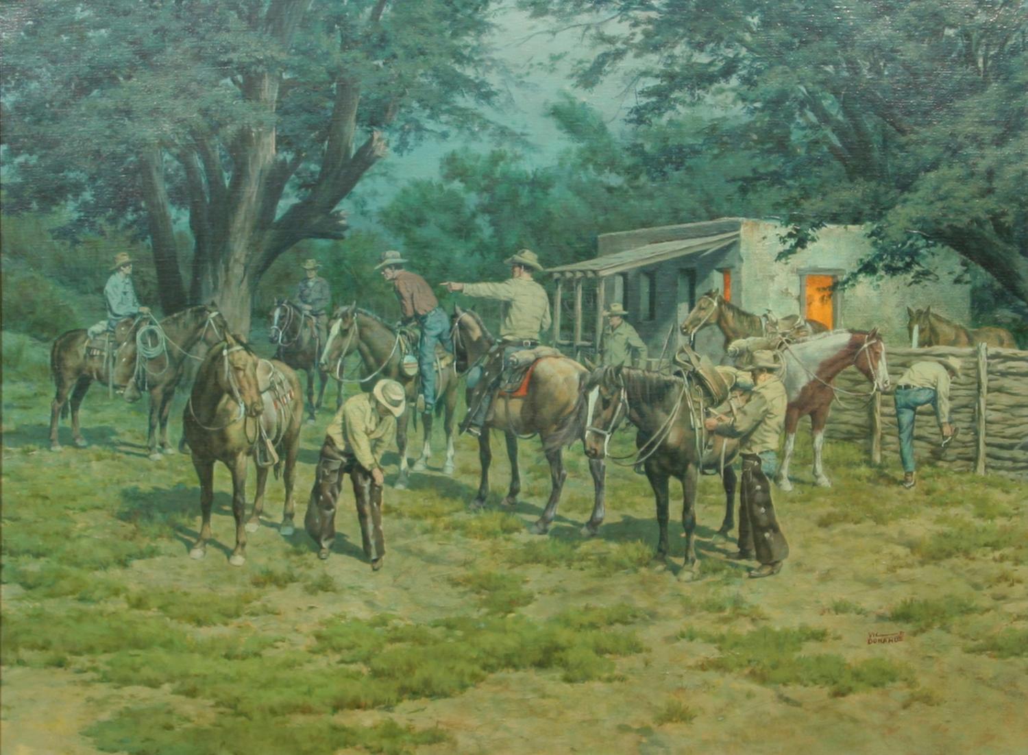 Vic Donahue (1918-2008). Mounting For Roundup. 30" x 40" oil on canvas. signed lower right. (est $3,000-5,000) Condition Report: Black lights clean and in nice distressed wood frame