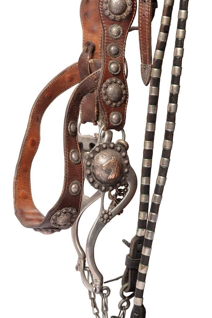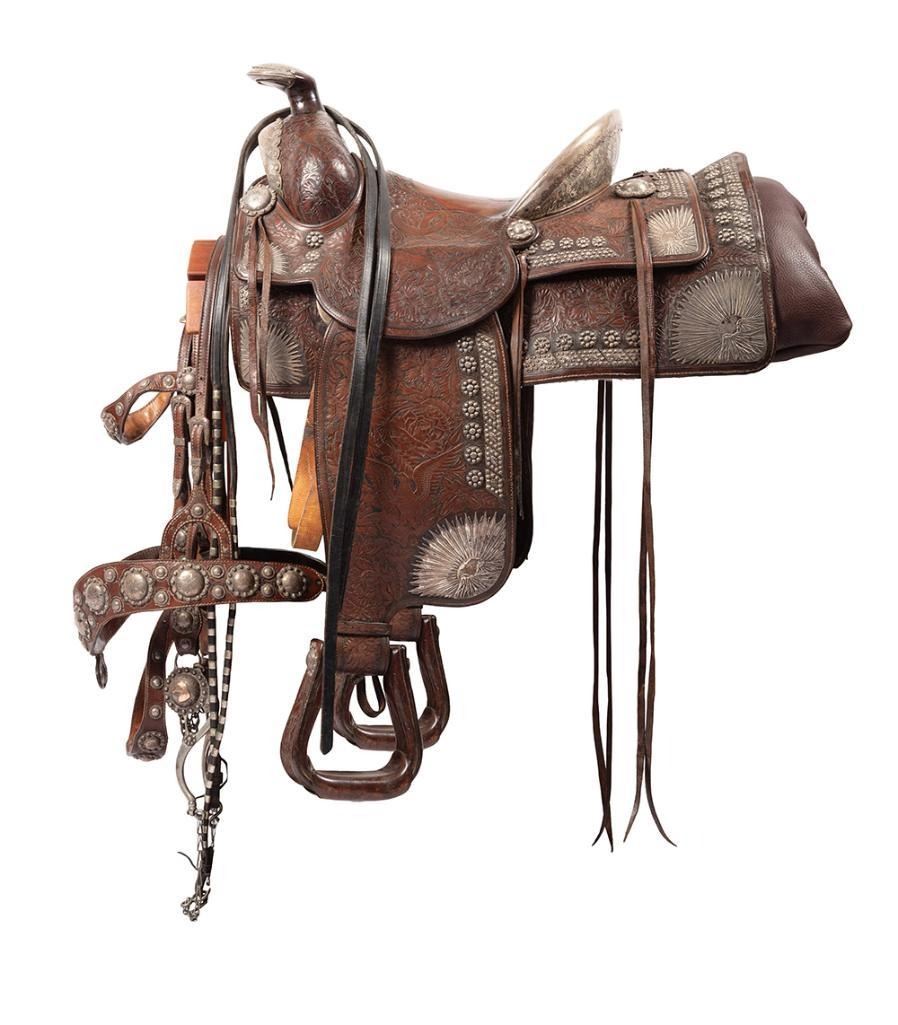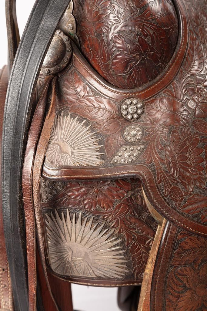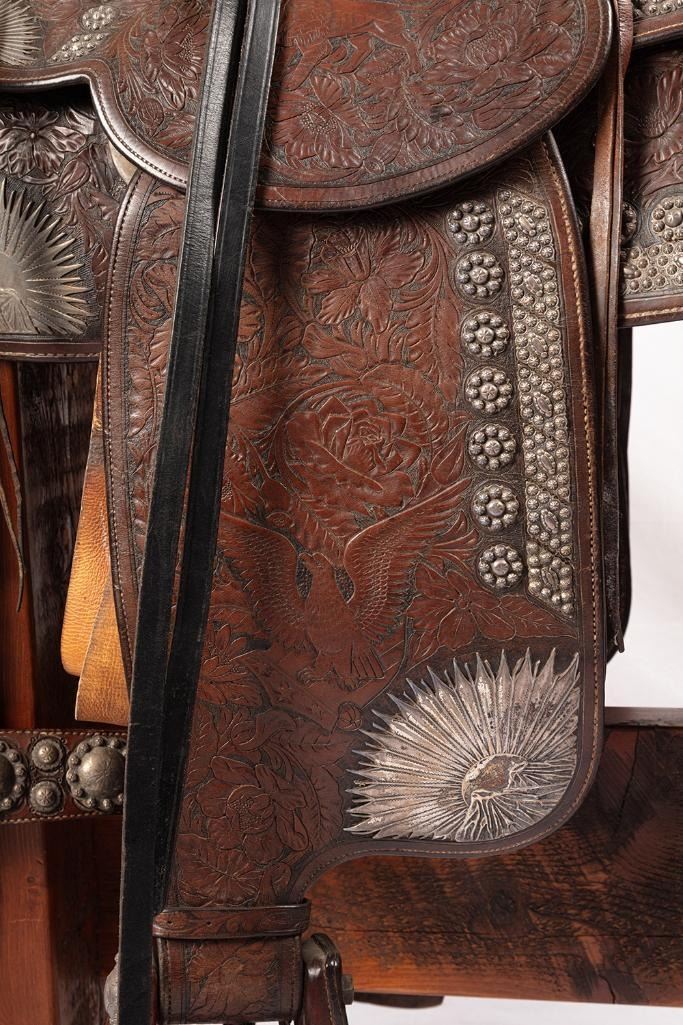 Silver mounted saddle with mountain and sun motifs, conchos and a tooled floral design. Includes matching headstall, reins, bit and martingale. Marked "Silver Dollar Brady" on back of seat and Visalia Stock Saddle, Co. emblem on cantle.