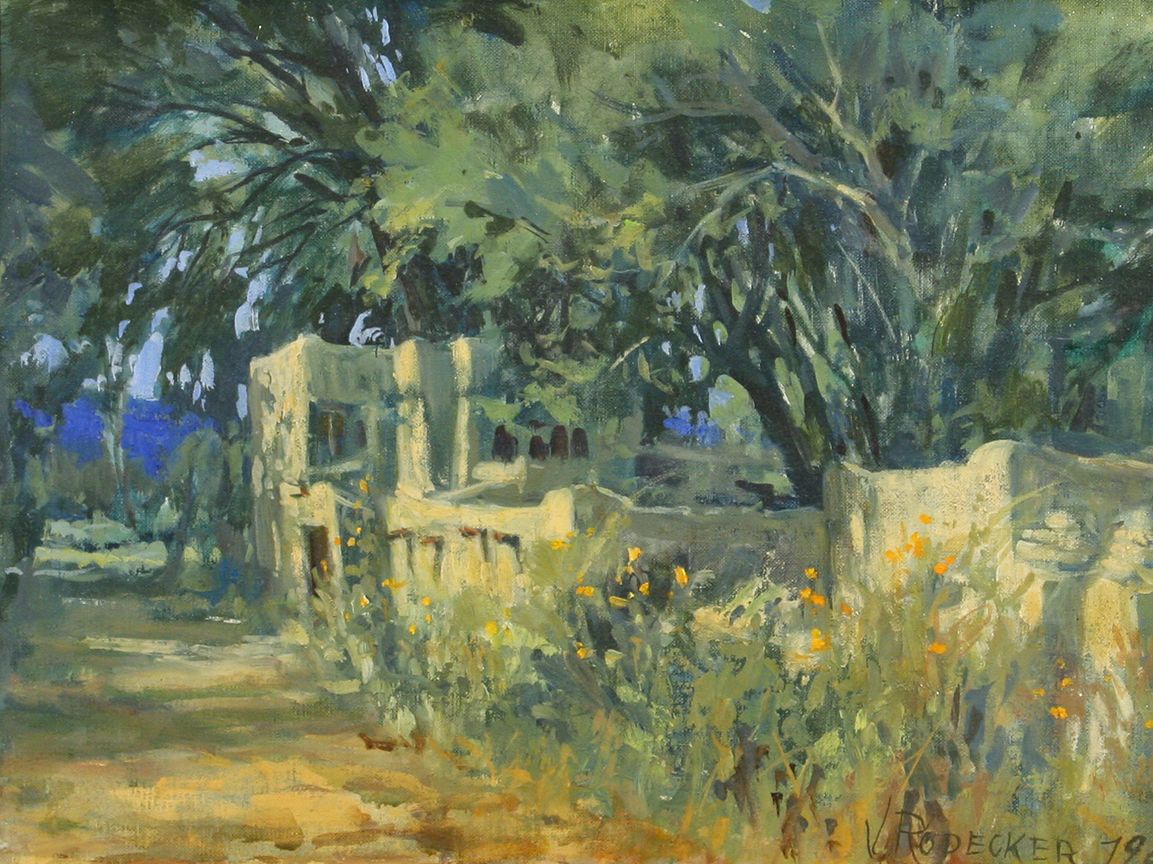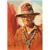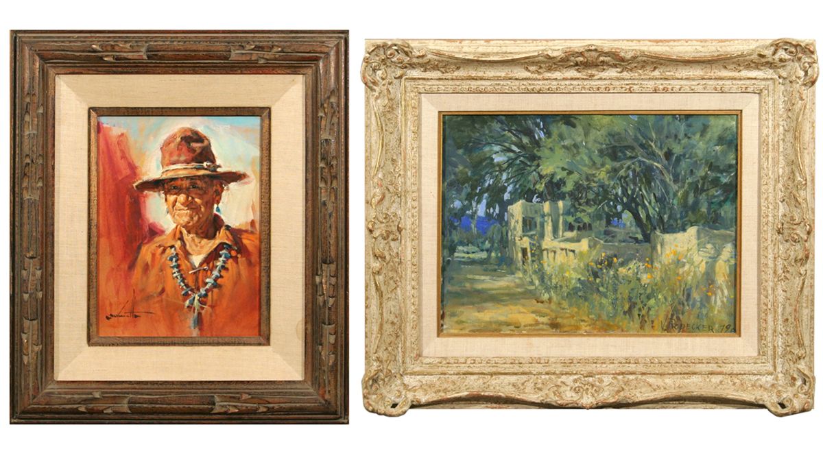 W. Clarence McGrath (1938 - 2007). Indian Man With Necklace. 12" x 9" oil on board. Signed lower left: McGrath. Virginia Rodecker Jarboe (1930 - 2007). Taos Street. 12" x 16" oil on canvas. Signed lower right: V. RODECKER 79. Provenance: The Estate of Douglas M. and Annette L. Jones, La Jolla, CA., Present owner, by descent. Condition reports can be viewed at www.marchinmontana.com/docs/2013CR.pdf