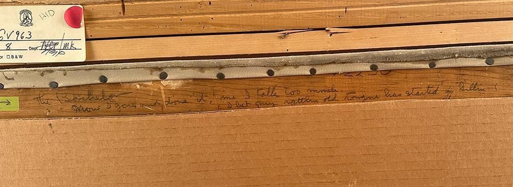 Verso: Inscribed: "The Bachelor. Now I gone and done it, me I talk too much. I bet my rattling old tongue has started on killin'."