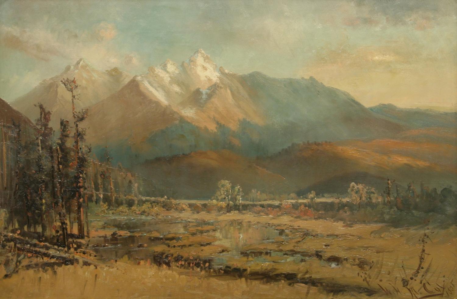 W. H. M. Cox (d. 1909). Mountain Landscape. 24" x 36" oil on canvas. signed lower right. 19th century. (est $3,000-5,000) Condition Report: 2 1/2" old repair patch. Blacklight shows about 2% touchup. Fance gold frame in fine condition
