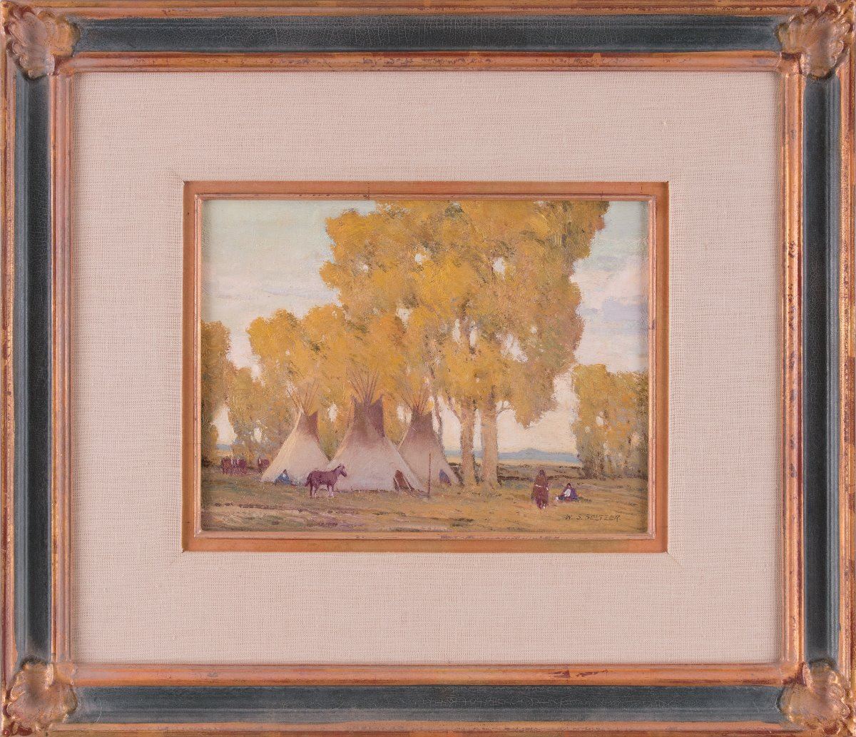 W. Steve Seltzer (1955 - ). Autumn Camp. 9" x 12" oil on board. Signed lower right.