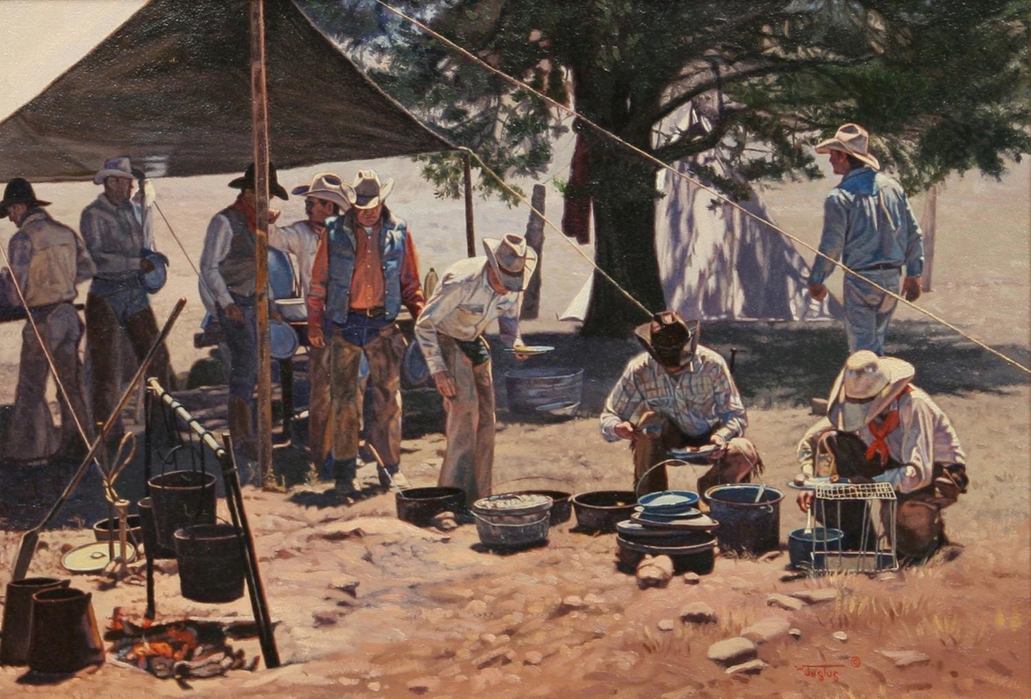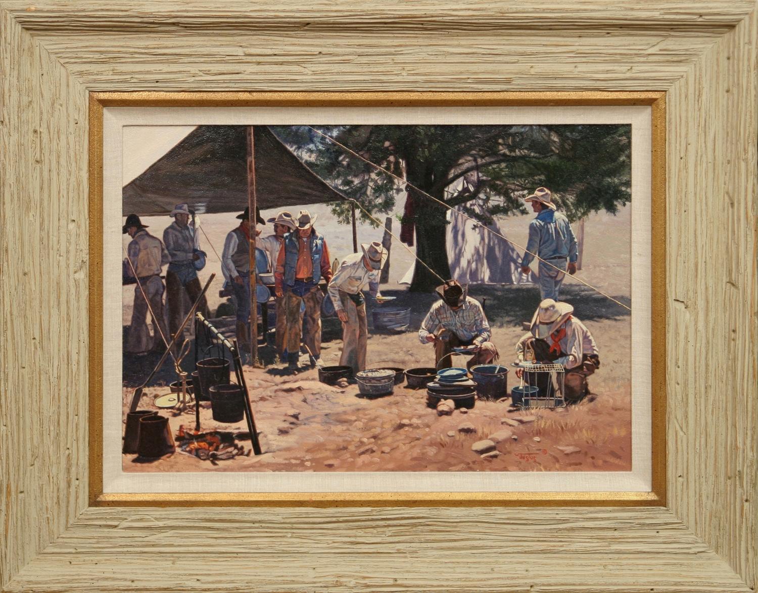 Wayne Justus (b. 1952). Noon Meal. 15" x 21 ½" oil on board. signed lower right. (est $1,000-2,000) Condition Report: Black lights clean