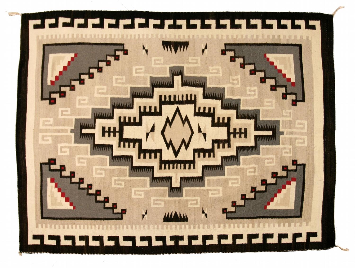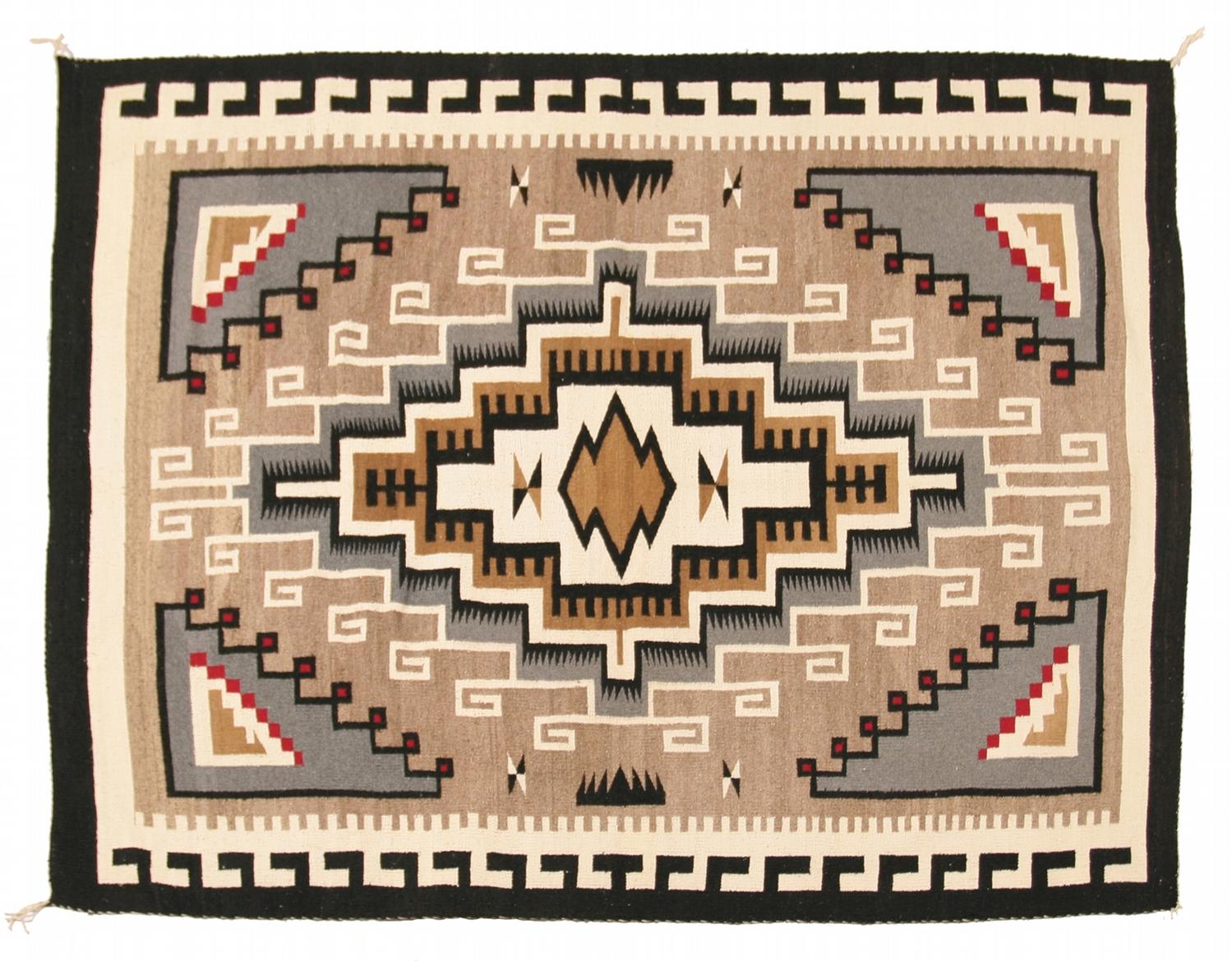 Western Reservation Weaving. 78" x 59". Greek key edge design. Colors are different on each side. Circa 1950s. (est $1,000-$2,000) Condition Report: No A/B sides. Excellent condition