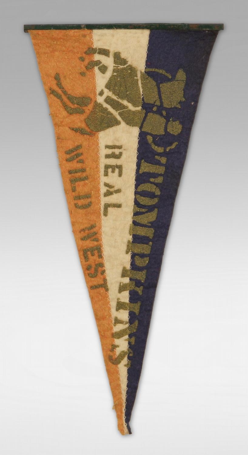 Wild West Show Beaded Vest and Pennant. Vest - 23" x 22". Felt Pennant from the "Tompkins Real Wild West" Show. 7 ½" x 16". Early 1900s. (est $600-800) Condition Report: Beadwork is generally excellent with minor losses. Back cloth backing is generally excellent. Fringe is intact. Pennant shows some discoloration from age but generally in excellent condition