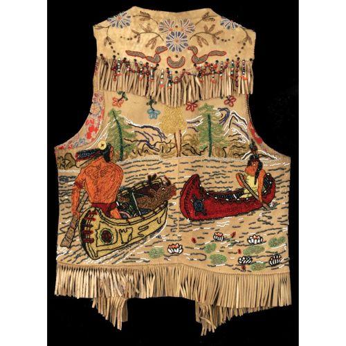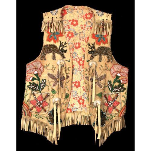 Wild West Show Vest, 22" long includes 2" fringe, Heavily beaded floral and pictorial designs on tanned hide, Floral cotton lining