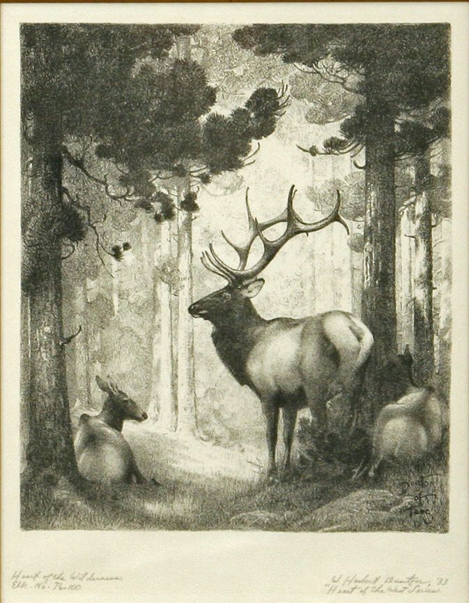 William Herbert Dunton (1878 - 1936). Heart Of The Wilderness: Elk. 11.75" x 9.75" lithograph. Pencil signed & inscribed in lower margin: Heart of the Wilderness. Elk. No. 76-100. W. Herbert Dunton, '33. "Heart of the West" Series. Condition reports can be viewed at www.marchinmontana.com/docs/2013CR.pdf