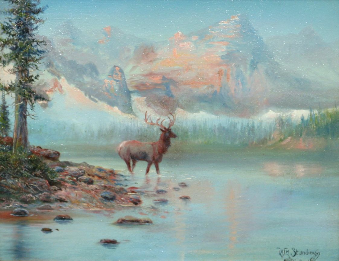 William Standing (1904 - 1951). Glacier Park Elk . 11" x 14" oil on board. Signed lower right: Wm Standing 29, [war bonnet] Fire Bear. Condition reports can be viewed at www.marchinmontana.com/docs/2013CR.pdf