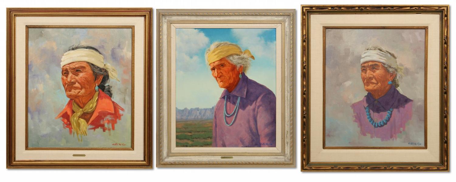 Willis M. Rue (1908-1991). Three paintings. 24" x 20" Oil on Canvas. (1) Jeb Tall Salt. (2) Jack Owl. (3) Niyol. each signed lower right. (est $800-1,200) Condition Report: All black light clean