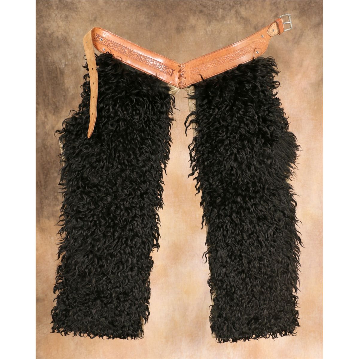 Woolly Chaps. 36" long lustrous black woolly chaps with an embossed floral belt. Canvas lined and leather backed with inside pockets. Early 1900s.